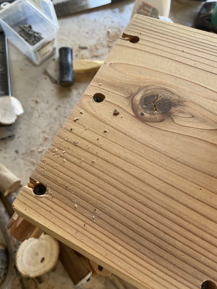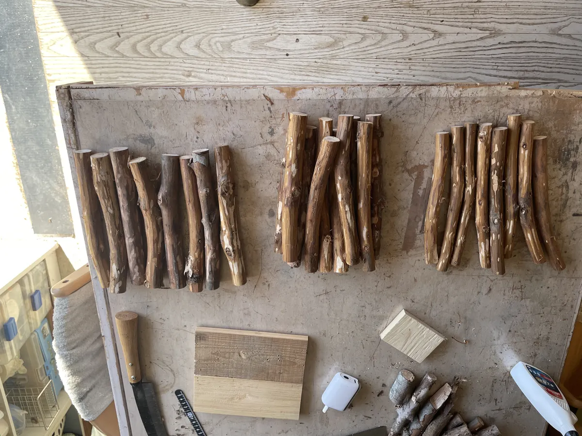 ネジ穴の部分は丸太?枝の切り出し端材を木工用ボンドでの接着です。