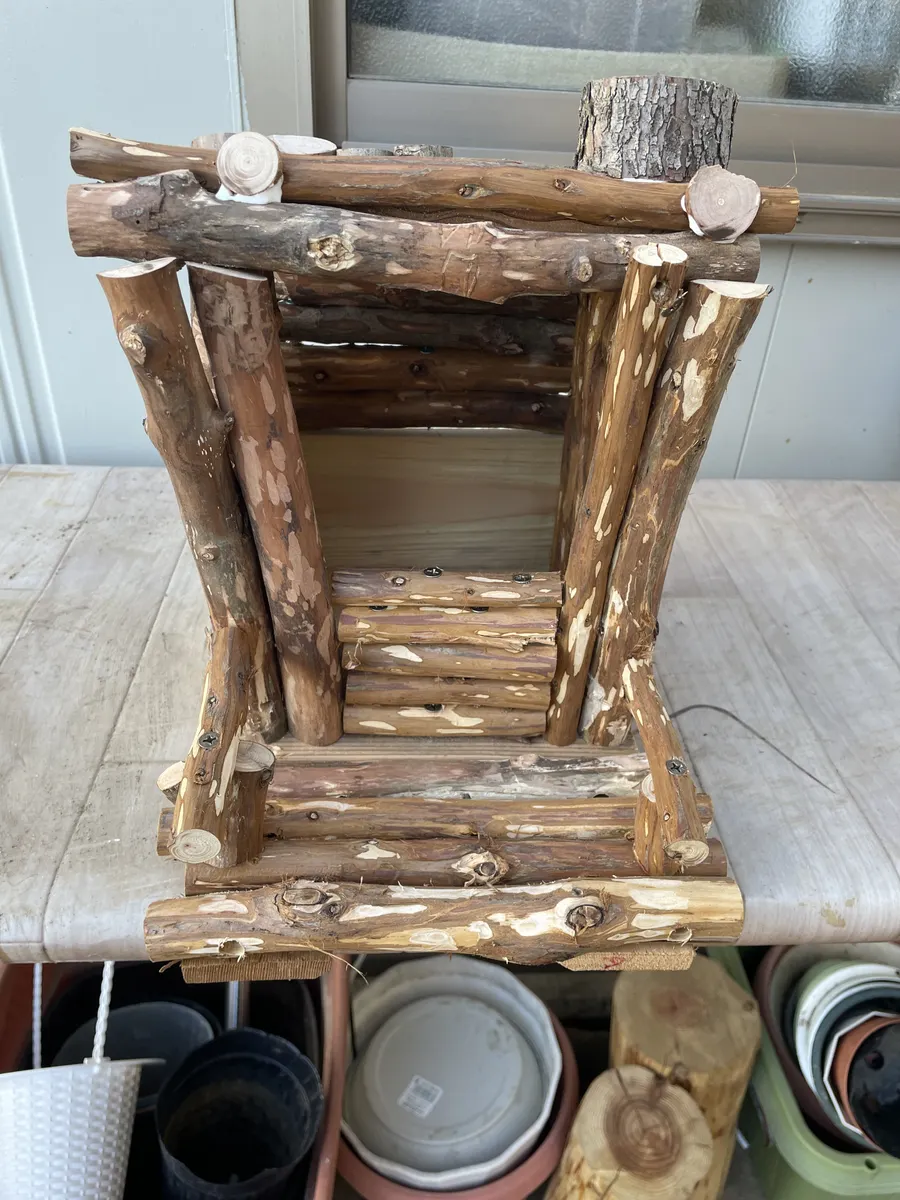 出来ました!丸太小屋というか、野鳥のバードハウスですね。