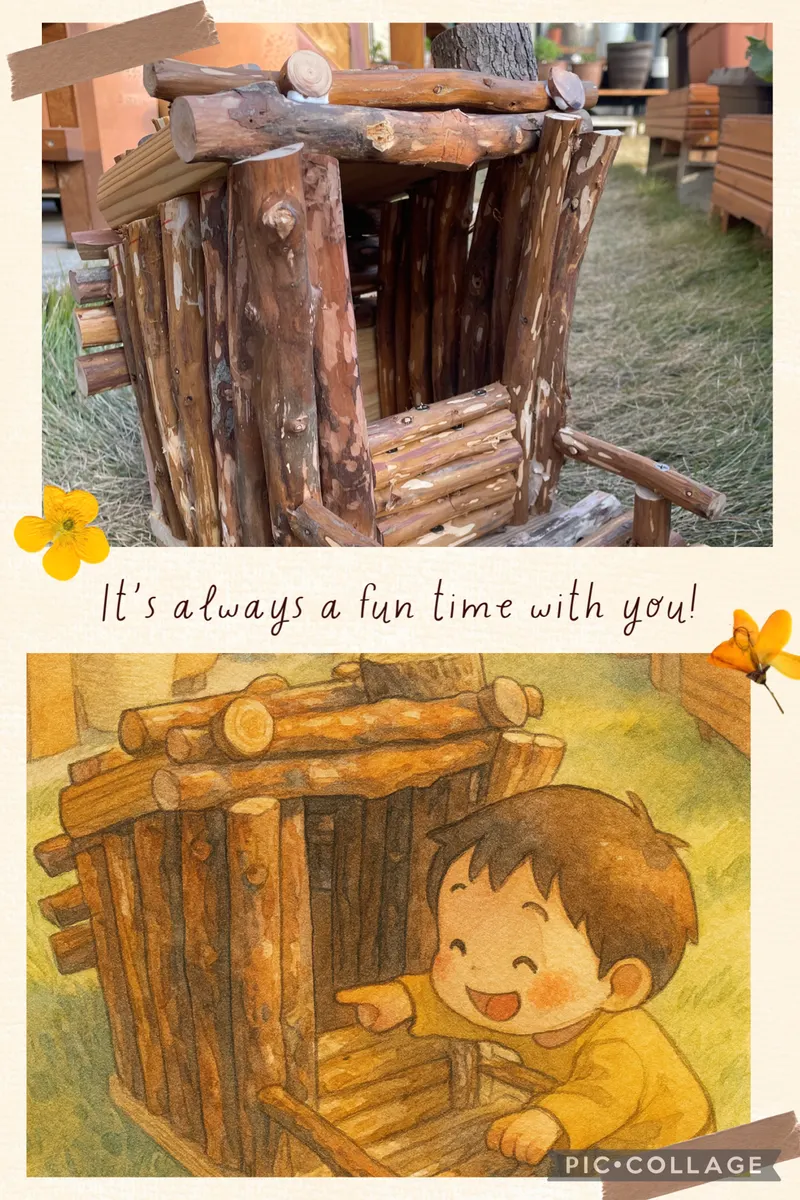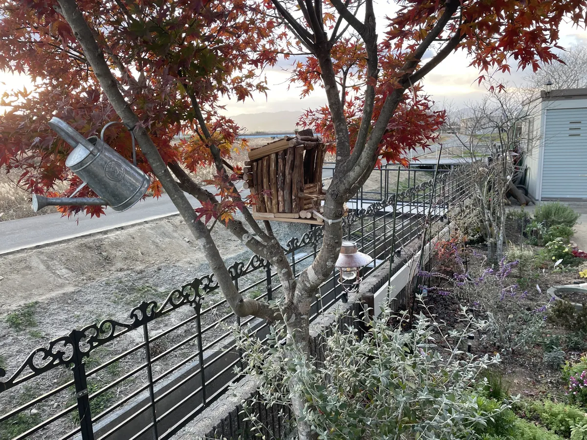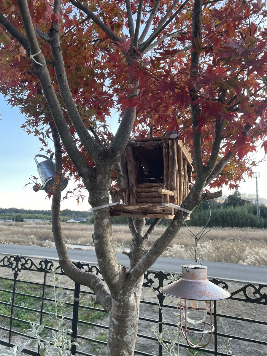 出来上がった丸太小屋を庭の紅葉の木に置いてみました🌲ツリーハウスですね笑笑