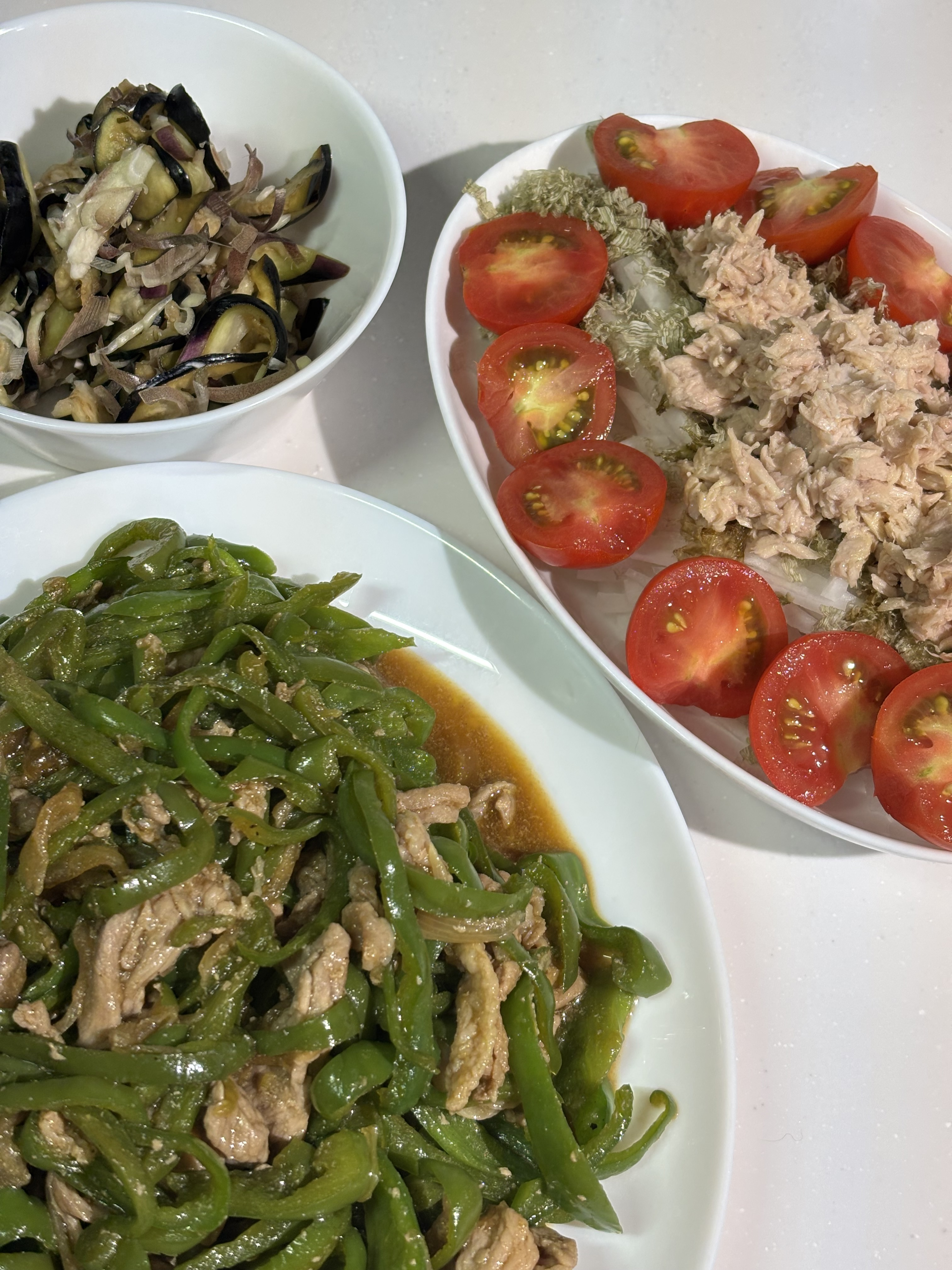 青椒肉絲と茄子と茗荷の漬け物大根とトマトのサラダ