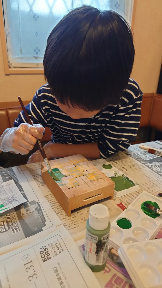 箱の裏をマス目に線をひきマインクラフトのクリーパーの目と口の部分だけマスキングテープで囲い黒く塗りました。