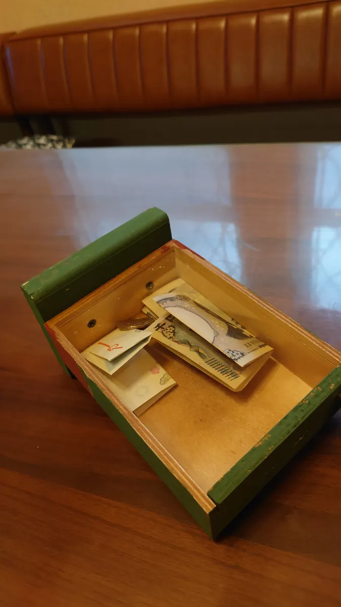 スライドの蓋は透明なのでいくらたまったかよく見えます。スライドの蓋の上の部分に丸いカンをつけて