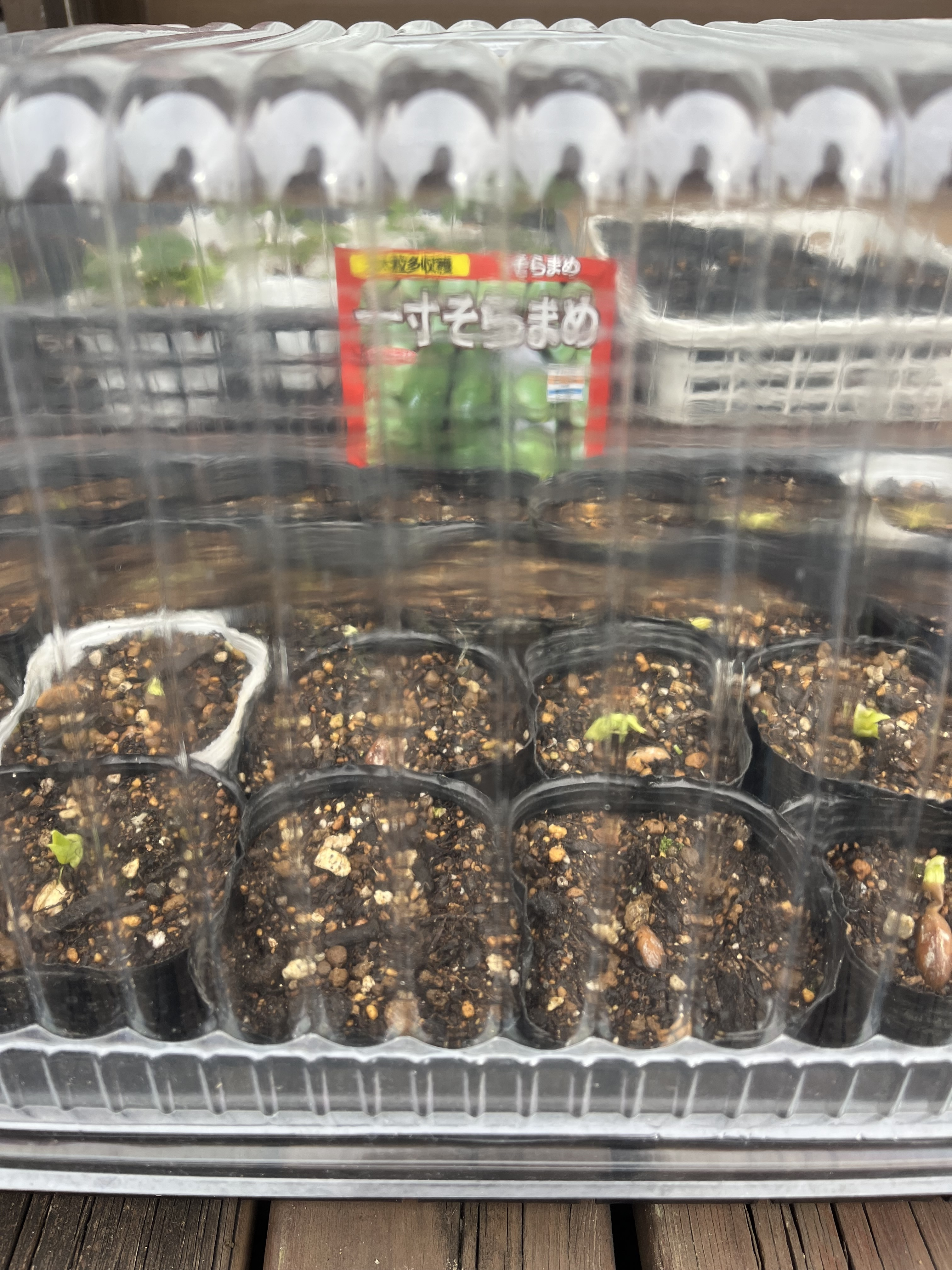 投稿を表示そら豆のちっちゃな芽、手助けしたくなりますね。🏡は種まきの時にプランターネットをかけてるので、一寸は防寒になってるかな?