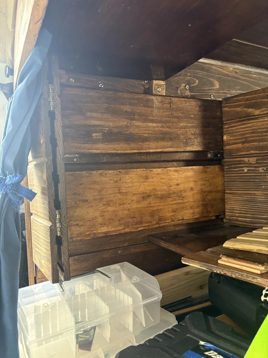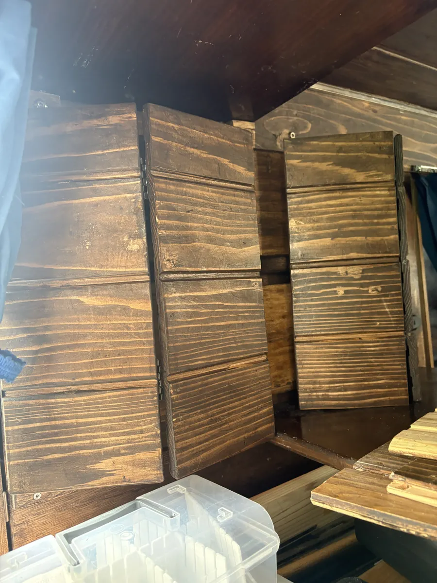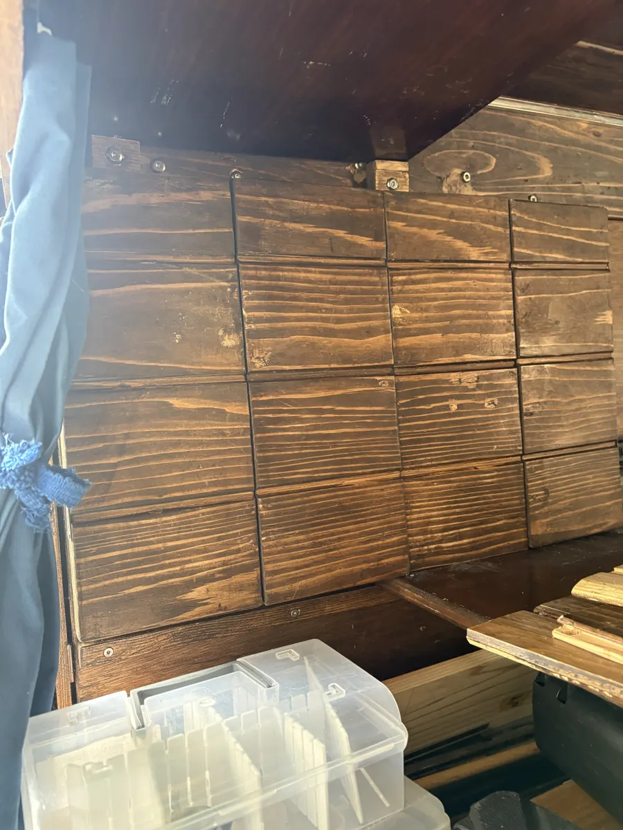 トップ > その他 > その他 > 現在の進行状況・・・・・26 棚板に折り畳み式観音開き扉 忍城の鷹 2026/02/17 16:05 現在の進行状況・・・・・26 棚板に折り畳み式観音開き扉 折りたたみ式棚板が展開したままで移動する時や就寝時に不安が有るので扉の 架装を考えていました。 幸い前作で使った材料が使えそなので加工して利用 羽目板を約15センチ幅でカットして接着(接着剤だけでは強度に問題があるかも?) 折りたたみ式の観音開き 棚板が平にならないので後日ストッパーを付けないと! 寄せ集めの材料なので板目が合わないですが・・・・・・・😭🙇♂️ 走行時扉が開いてしまいそうなので中心部に留め具を付けないと・・・・・!! いいね 共有する 共有する X LINE リンクをコピー コメントする 6 件の返信 (新着順) ミュートしたユーザーの投稿です。 投稿を表示 さくら♡ 2026/02/20 23:00 カインズさんのカッコいい留め具探しに行かなきゃ💨 いいね 返信する ミュートしたユーザーの投稿です。 投稿を表示 忍城の鷹 2026/02/21 19:45 さくら♡ さくらさん♡ 有難うございます。 杉出隅を買いに行った時に見てきたんですが気に入った物がありませんでした。 取り敢えずは手持ちの留め具が有るのでそれでも良いかな?なんて思っています。 いいね 返信する ミュートしたユーザーの投稿です。 投稿を表示 さくら♡ 2026/02/21 20:00 忍城の鷹 とりあえず、気にいるのが見つかるまで凌ぐのはありですよね🥰 いいね 返信する ミュートしたユーザーの投稿です。 投稿を表示 ぷぅ 2026/02/19 14:22 すご〜い いいね 返信する ミュートしたユーザーの投稿です。 投稿を表示 りお 2026/02/19 00:45 走行時の安全対策は必要ですね 頑張れ! いいね 返信する ミュートしたユーザーの投稿です。 投稿を表示 mi 2026/02/18 22:22 すごい大作✨ 出来上がりが楽しみ😊 いいね 返信する ミュートしたユーザーの投稿です。 投稿を表示 ダンボ 2026/02/18 16:55 ただただすごーい! いいね 返信する ミュートしたユーザーの投稿です。 投稿を表示 チコリ 2026/02/18 01:31 寄せ集めの木材でここまで作れるなんてすごいです! 留め具にも拘りたくなりますね✨ いいね 返信する