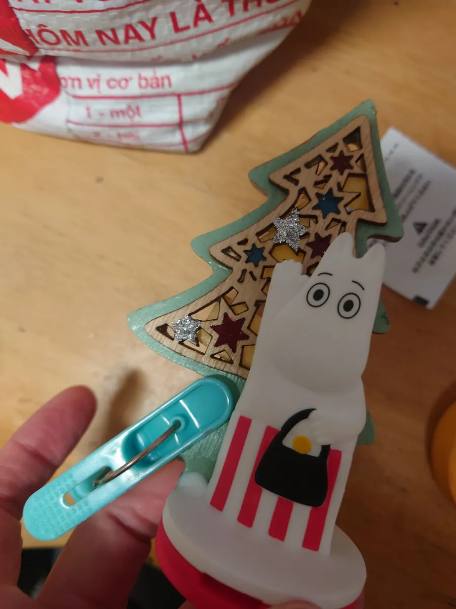 ツリーの飾りは土台を外してムーミンママにビス止め