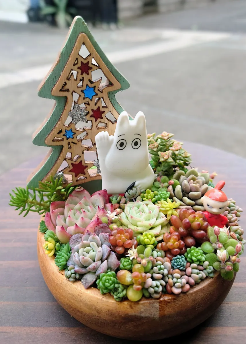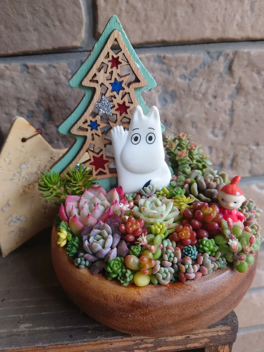 色とりどりの多肉に埋もれたムーミンママとリトルミィ、可愛いです😍