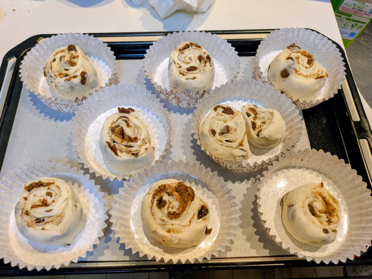 成形して分割しベーキングカップに入れ40度のオーブンで2倍に膨らむまで、二次発酵します