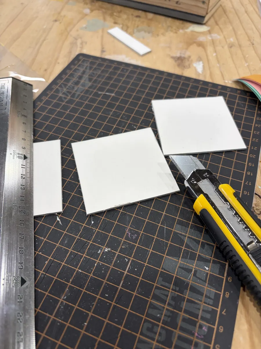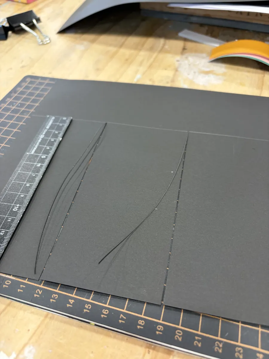 製本に挟む用紙のカット。テンプレートに合わせ線を引いた後カットします。