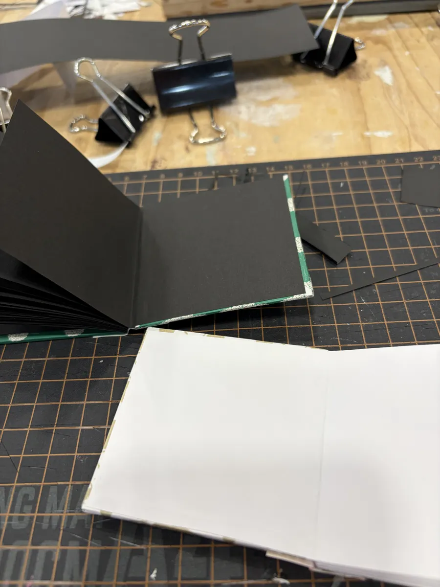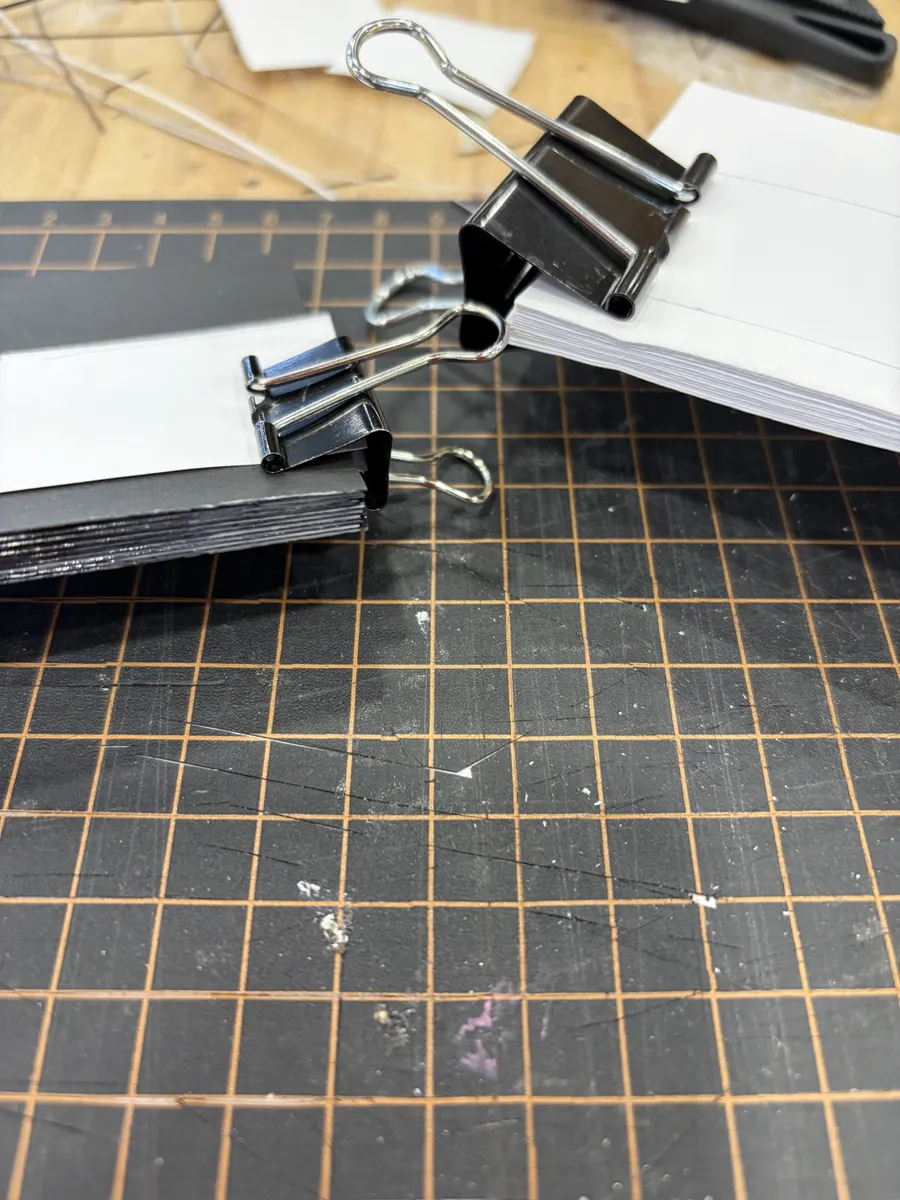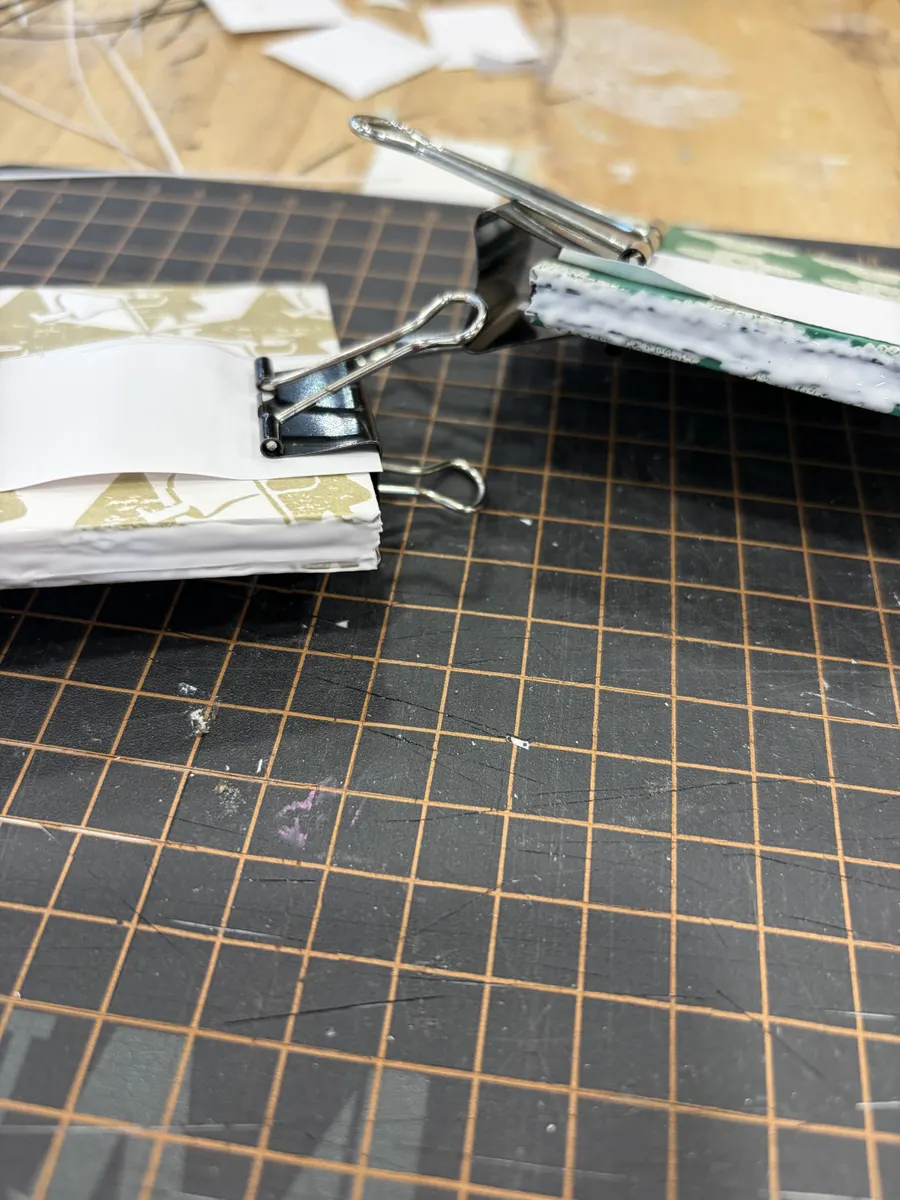 中に入れる用紙と表紙、背表紙を合わせWクリップで挟みボンドで止めます