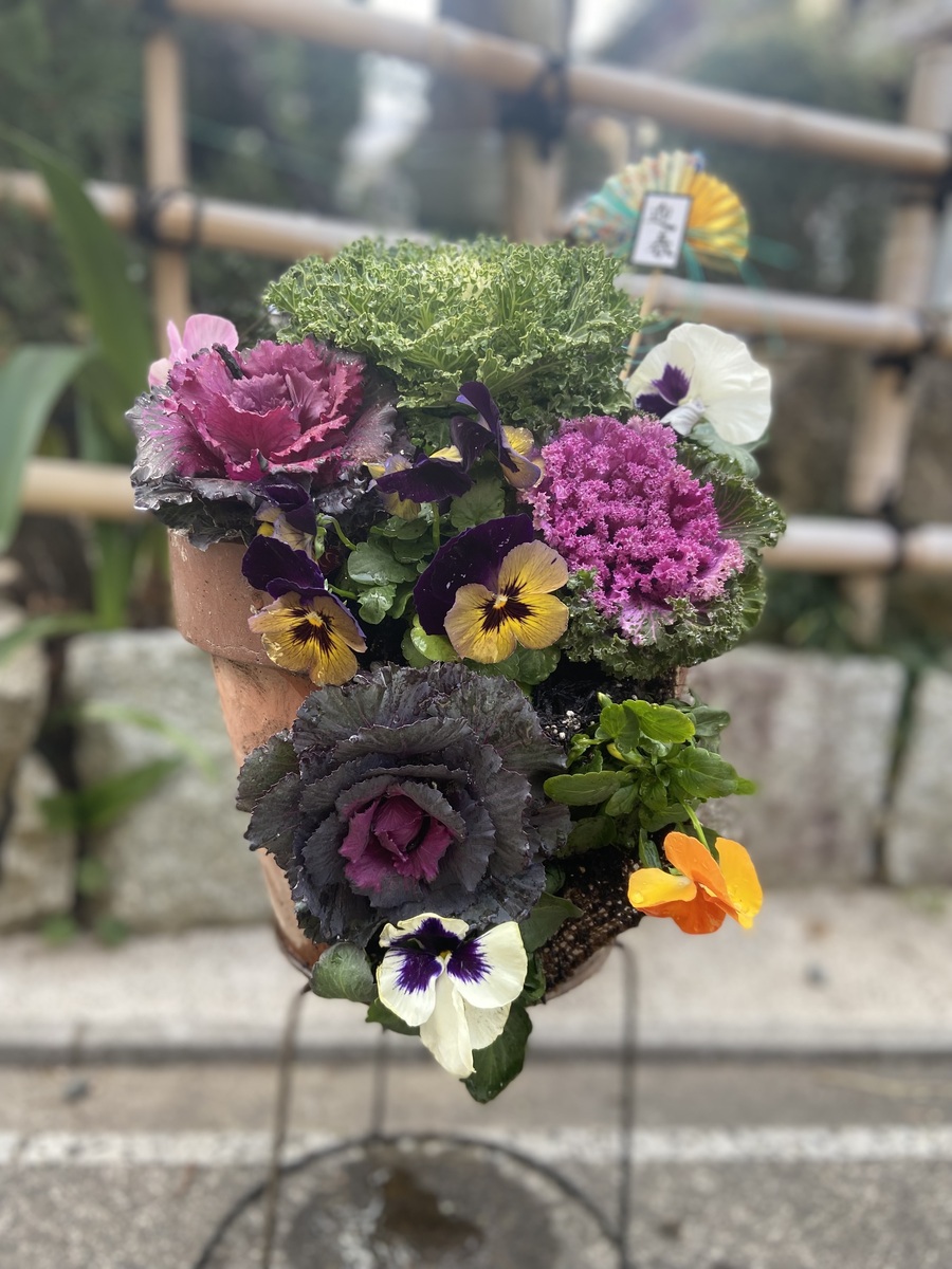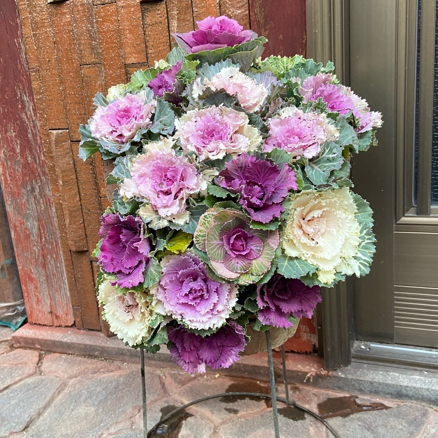 葉牡丹オンリーの寄せ植えで豪華で艶やかです😊