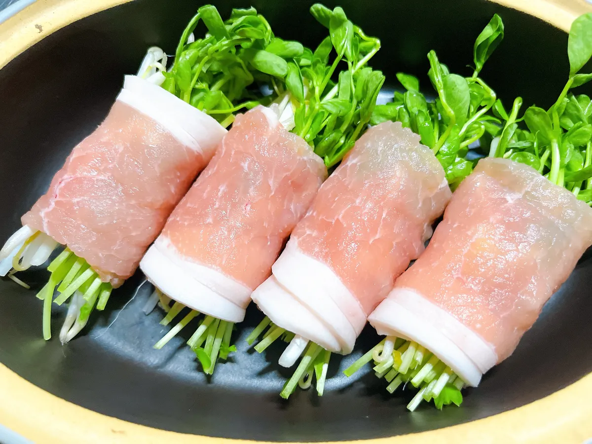 お肉を広げて、豆苗ともやしを巻いてパスタポットに並べていきます。
