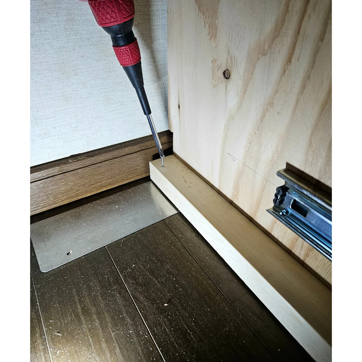 引出しを閉めた時に壁のラインと揃うようにします。