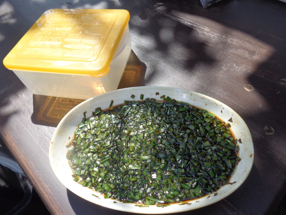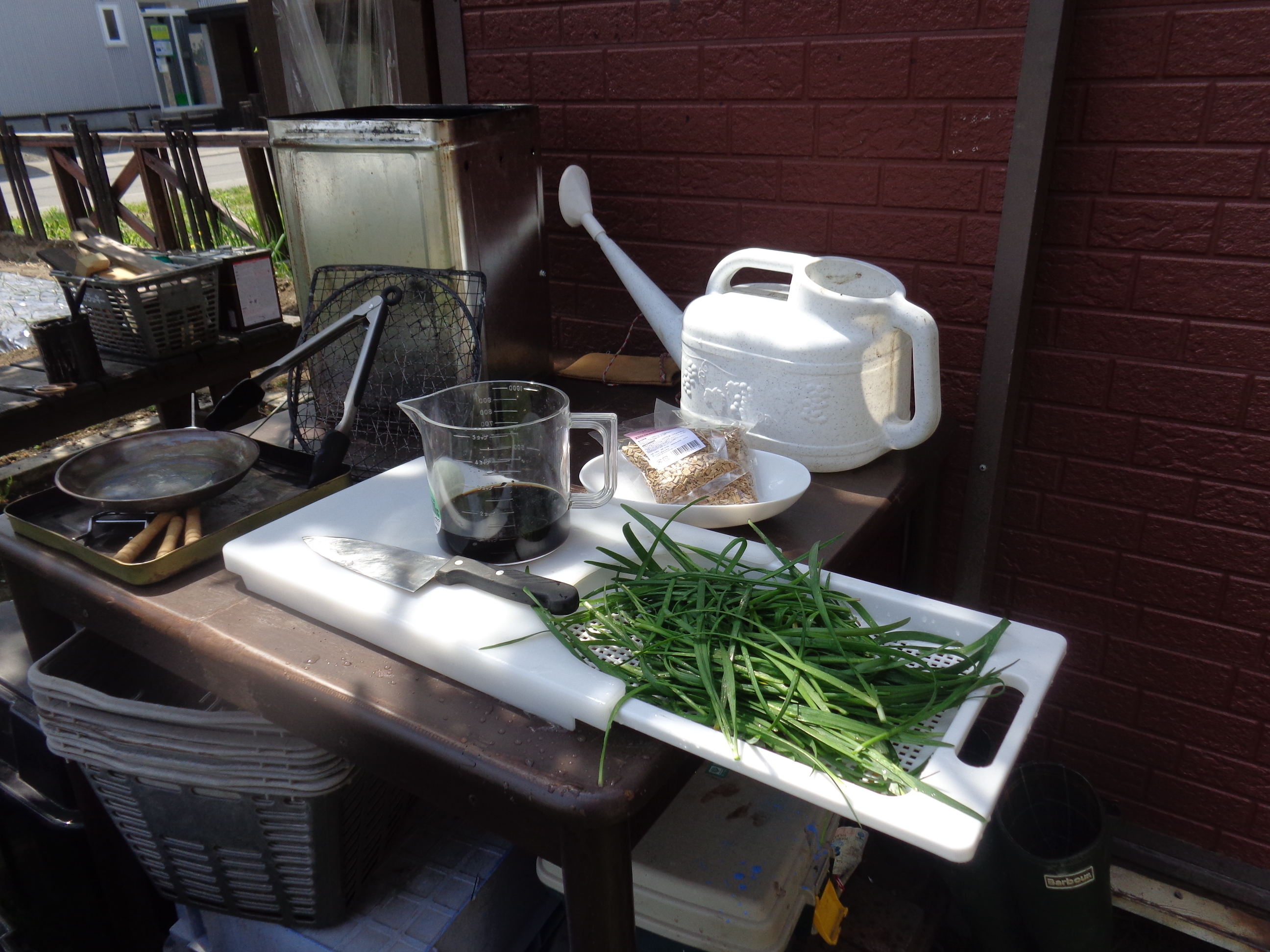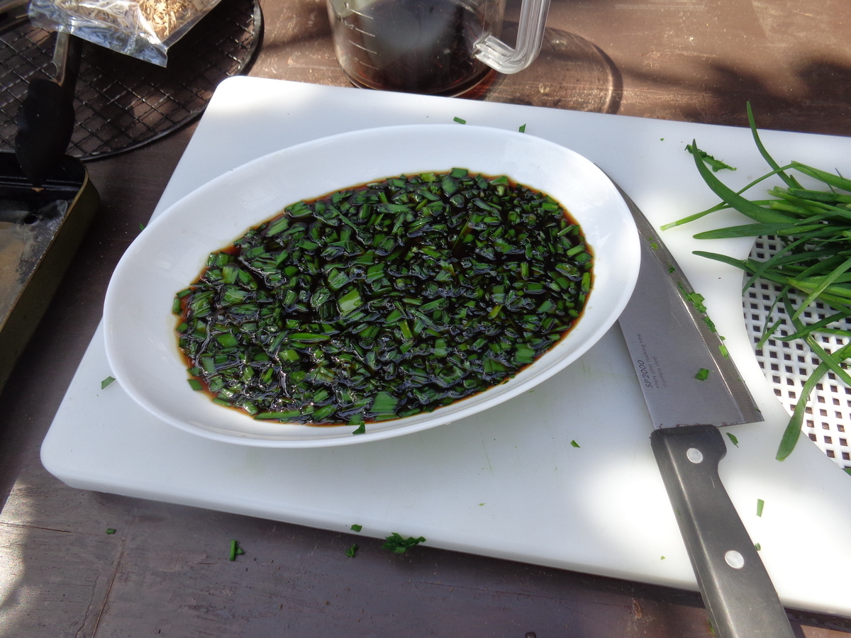 こんにちは、totoroです。今日は、仕事がお休み、絶好の家庭菜園日和です。朝から種を撒いたり、苗を植えたり大忙しでしたが、ひととおりの作業を終えたところで、お楽しみタイムの菜園クッキングです。DIYで作成したガンガンスモーカーで「ニラ入りの燻製醤油」を作ってみたいのです。