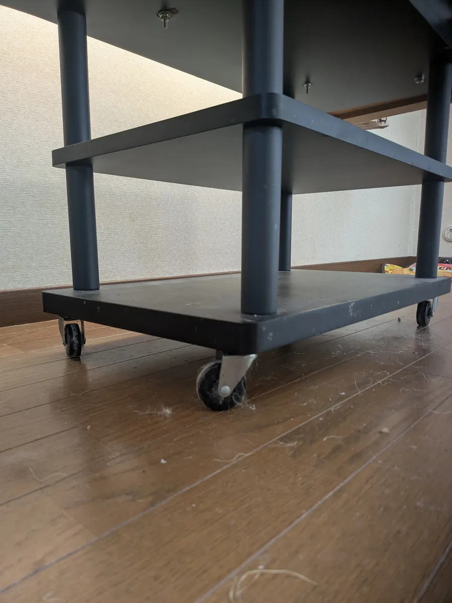 不要になったキャスター付きのTV台と、部屋の片隅に固定していたキャットタワーを合体させ、タワーごと移動できるようにしました。