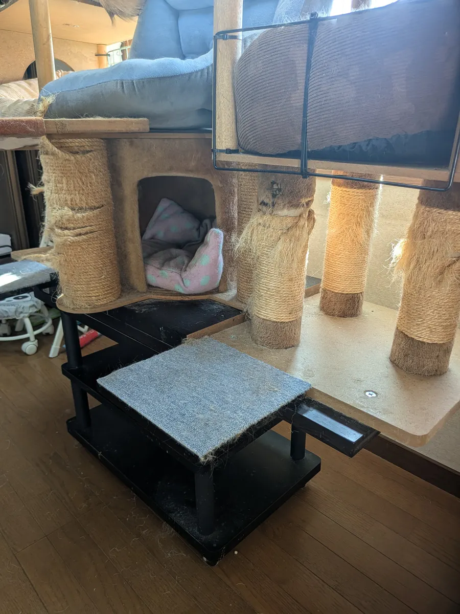 ただ乗せただけだと、乗り降りするときに大変そうだったので、ステップを付けてタイルカーペットを貼り付けました。貼り付けには超強力接着剤を使用したので、爪とぎされても大丈夫!
