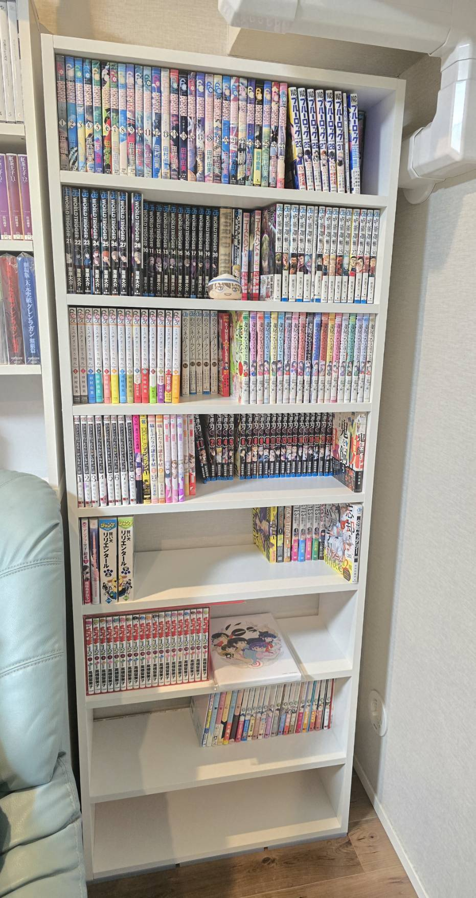 既存の本棚(アイリス製:画像左)と壁との間にちょうど良いサイズの棚が見つからず、せっかくDIY覚えたし作っちゃえということで(笑)。本のサイズに合わせて棚板の間隔を決め、奥行きも2冊入る長さにしたので無駄な隙間なく収納力抜群です☆カインズで化粧板を買いカットしてもらって家で組み立てました。後日カットしてくれたスタッフさんに見せたら「大物なのに歪みなく綺麗にできたねえー!」と褒めていただけましたやったね(*´ω`*)