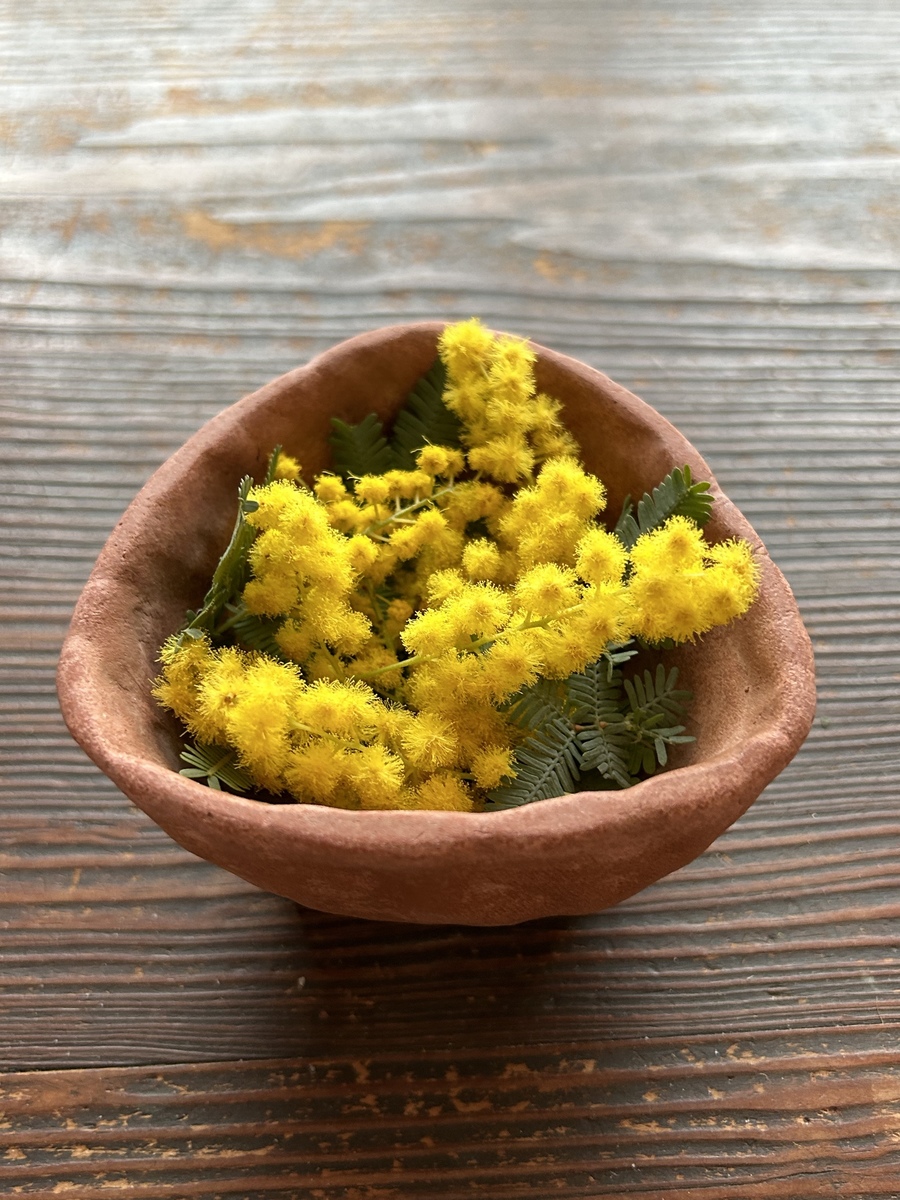 陶土のミニ鉢カラーとミモザの黄色が合っていて、温かい感じが伝わります💕