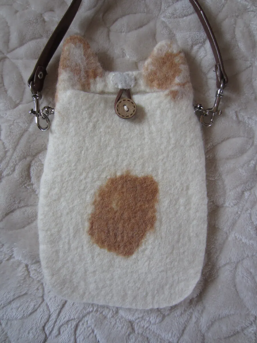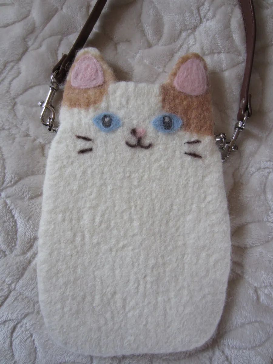羊毛フェルトを縮じゅうし、フェルト化して作った猫のスマートフォンケースです。