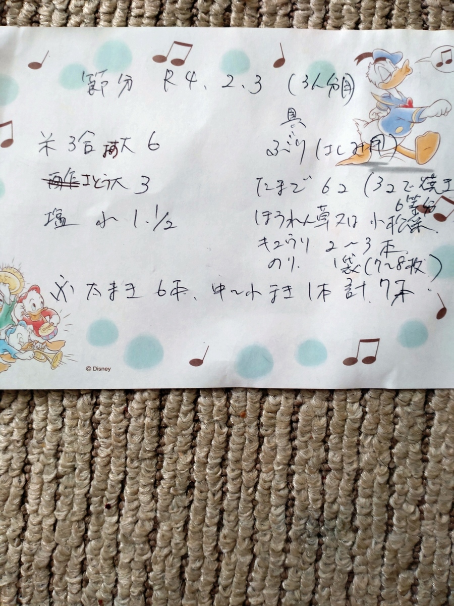 最近は汚いメモで太巻きのレシピを来年の参考用に残しています。裏には今年の具とレシピがメモってあります。今年の酢飯の量は同じです。本数も同じでした。