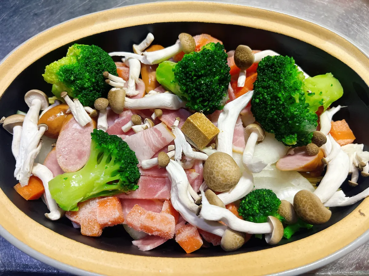 野菜などをカットして、調味料以外の材料をパスタポットに入れ蓋をかぶせ、レンジで500Wで3分加熱したら、蓋を外して軽く混ぜる。