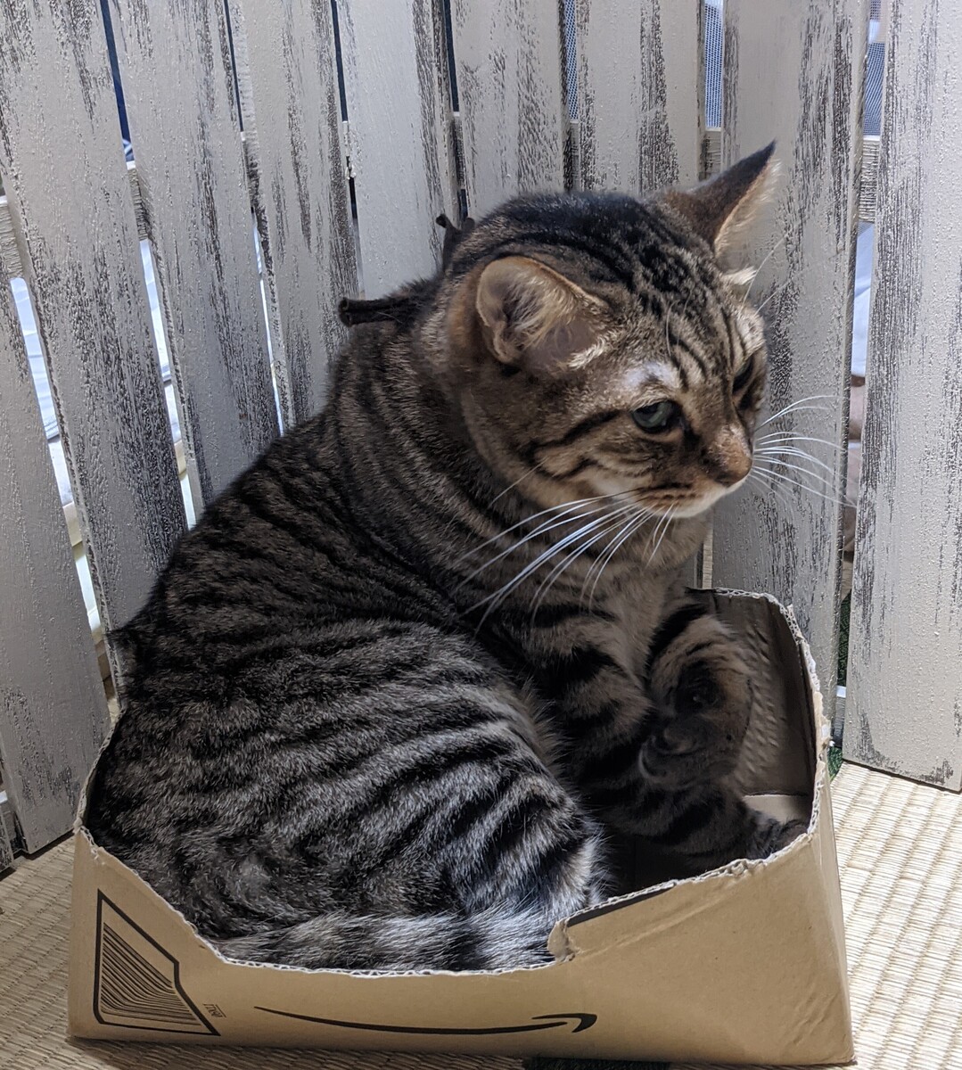 ちょっとの間アマゾンの箱を中に入れて慣らしてもだめかなぁ〜🥳
