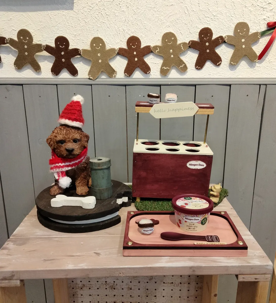 投稿を表示前の作品持参されたんですね😃並ぶとより可愛いですね。アイス屋さんみたいで素敵😊自分もちっこいハーゲンダッツ気になりました😳🍨