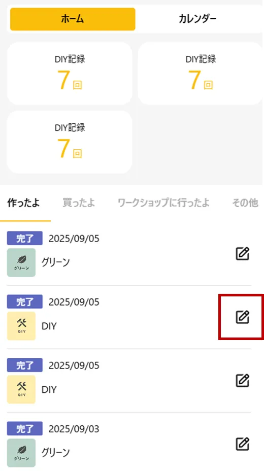 トップページ「DIY DIARY自分の記録を見る」、または画面右下の「DIY DIARY」アイコン→「DIY DIARY記録」をタップするとご自身の記録内容を確認することができます。