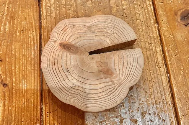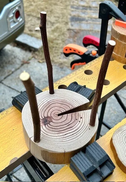 コースターより一回り大きな丸太を輪切りしてサンダーかけて、ドリルで穴開けて適当な木の枝を差し込みます。