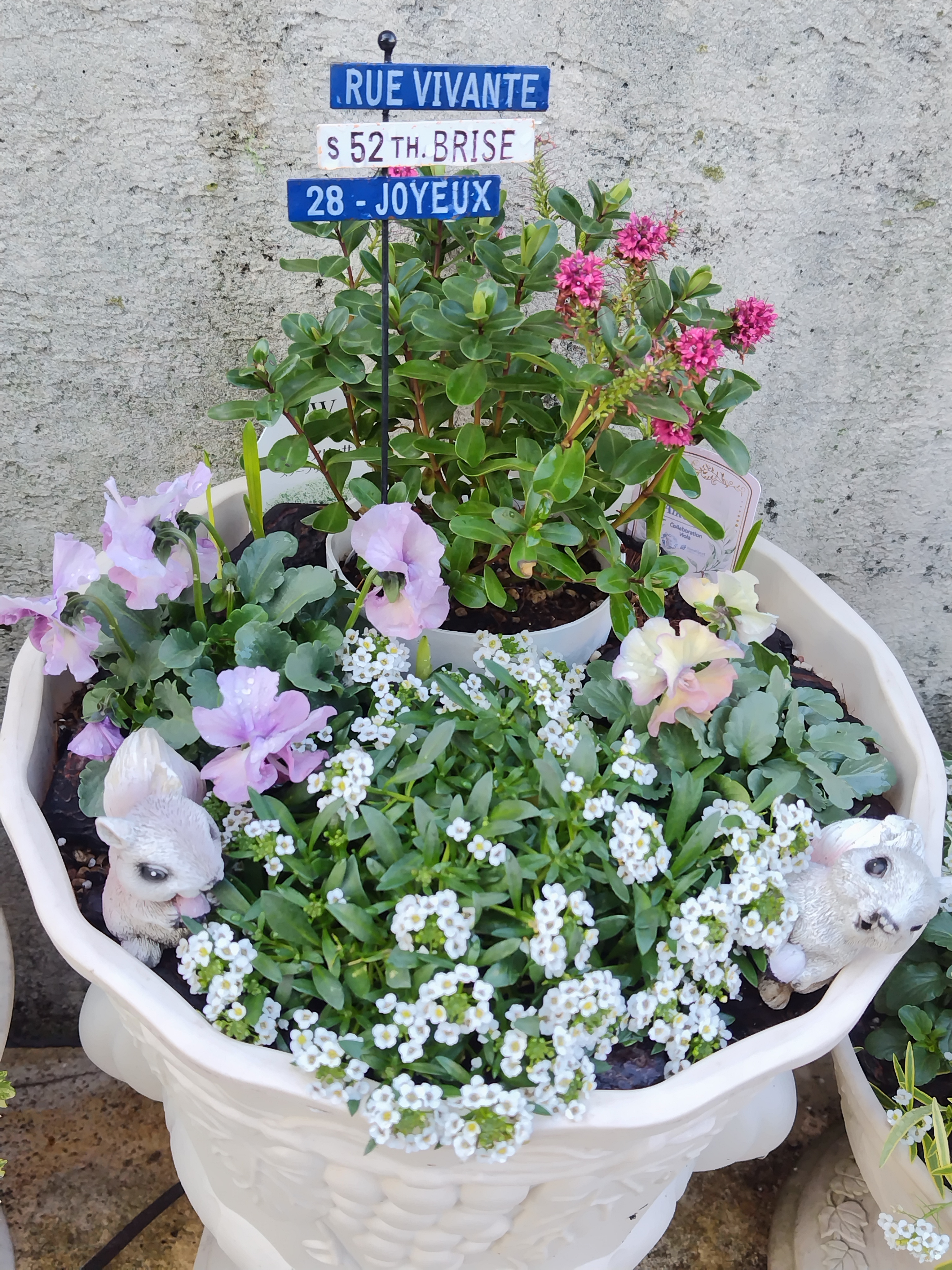 大きめのスタンド鉢に植えていて大株になり、3年間咲き続けてくれたスーパーアリッサムが夏に枯れてしまったので、新しく寄せ植えを作りました。