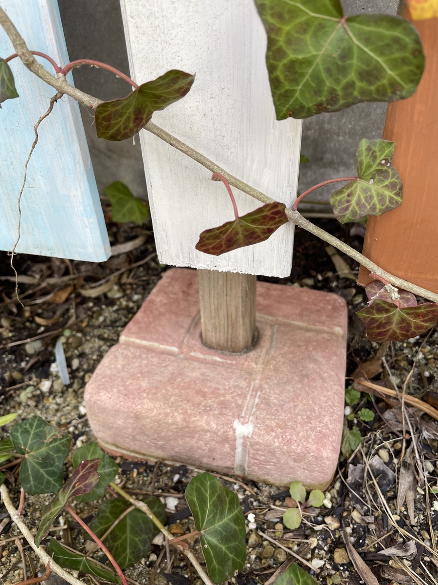 と、言うことでフェンスにリメイク🎶 下は揃えて上は不揃いにカット、シャビーペイントして繋げて、土に直差しはしたくなかったのでカインズさんのレンガ風ライトスタンドの穴に差し込んでレンガ部分を半分くらい土に埋めて完成。