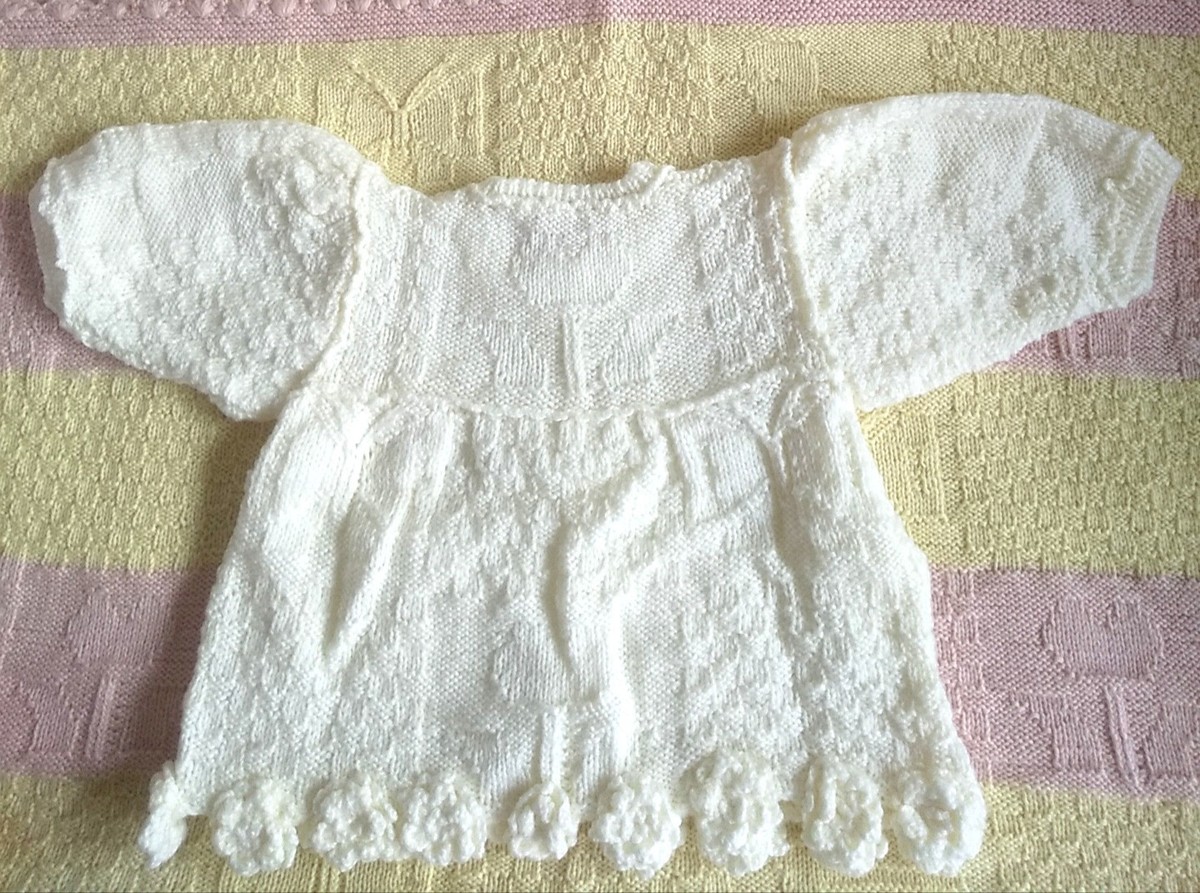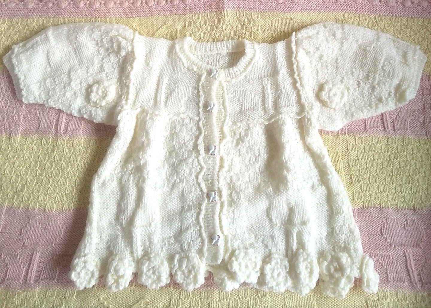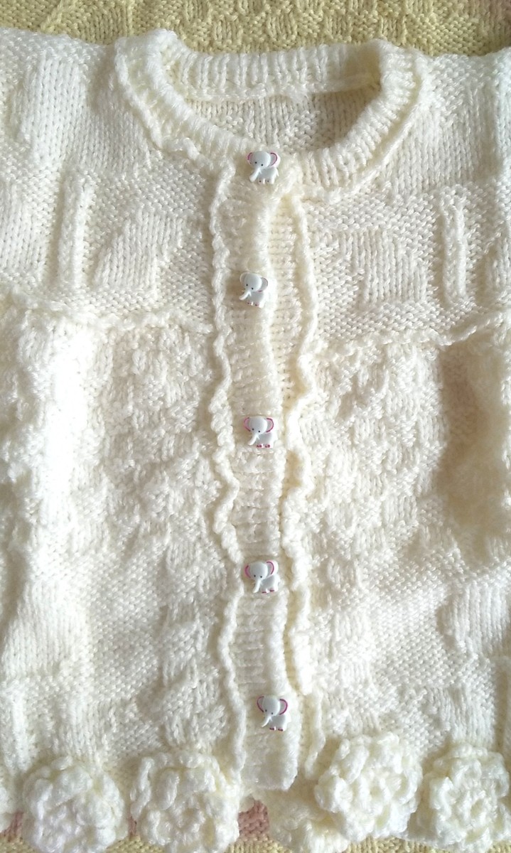 男の子か女の子か分からなかったので、シンプルに白の毛糸に、モチーフを付けて編んだカーディガンです。