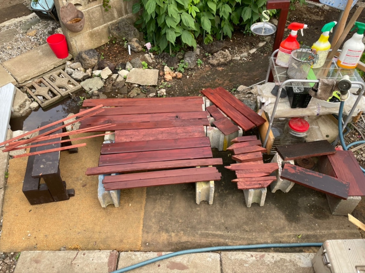 平板や杭用の材を水洗いしてガーデン塗料で再塗装します。こんな感じで乾かしてます。↓
