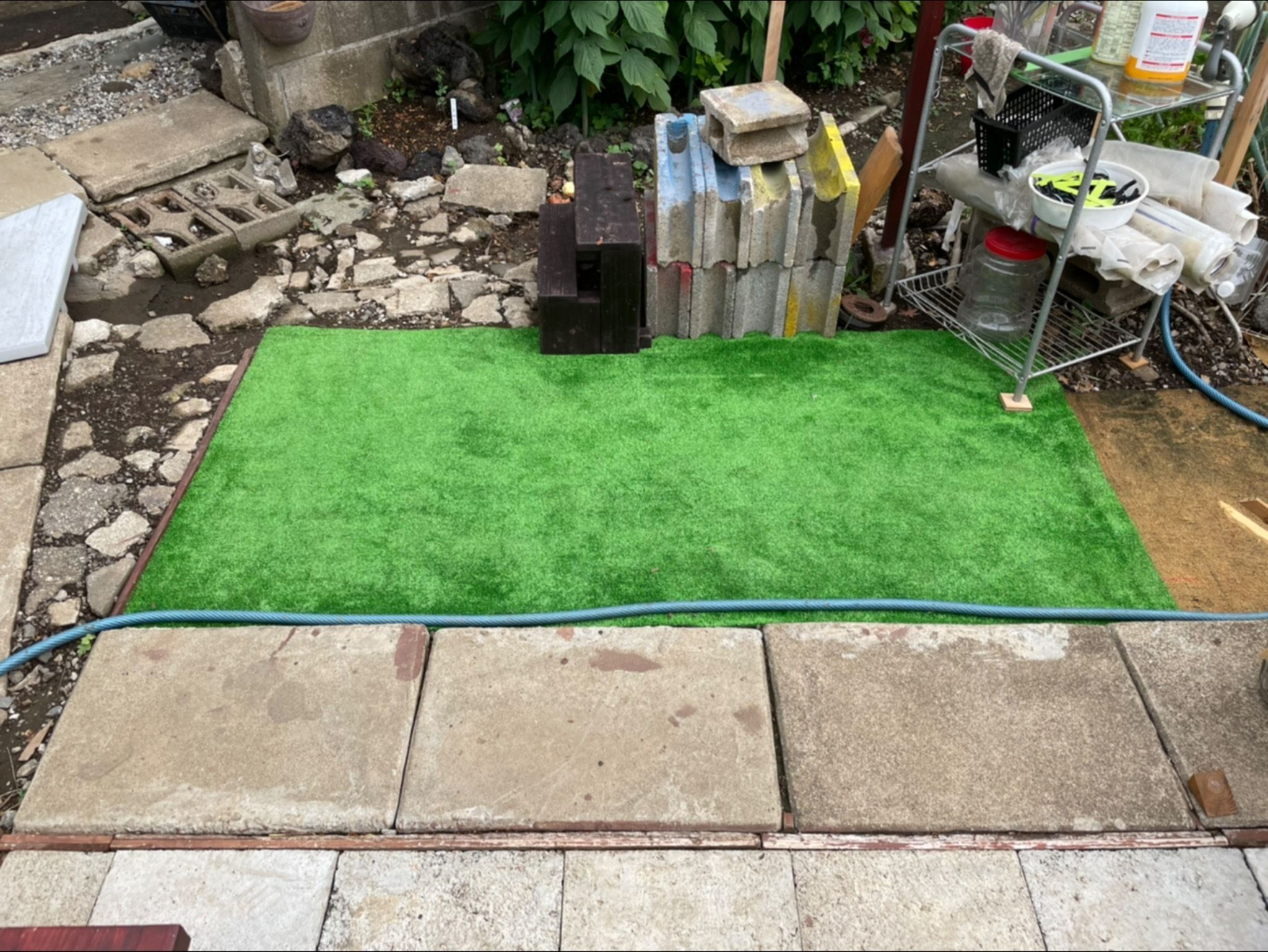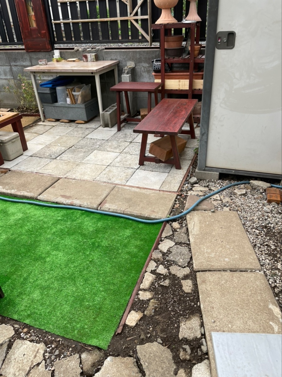 ただ人工芝敷くだけでは芸がないので、人工芝の周りも整えます。ガーデン塗料を施した平板を埋めてエリア決めにしたり、敷地内から出たコンクリ端材を地面に埋め込んで地盤を固めたりしています。↓