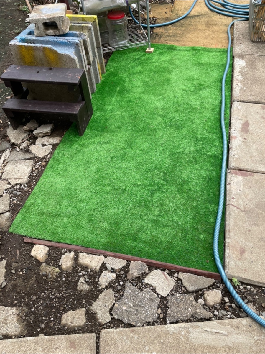そんな時、黒ずんできた(右手の)古いカーペットを何とか出来ないか?と、一畳大の人工芝を敷いてみました。