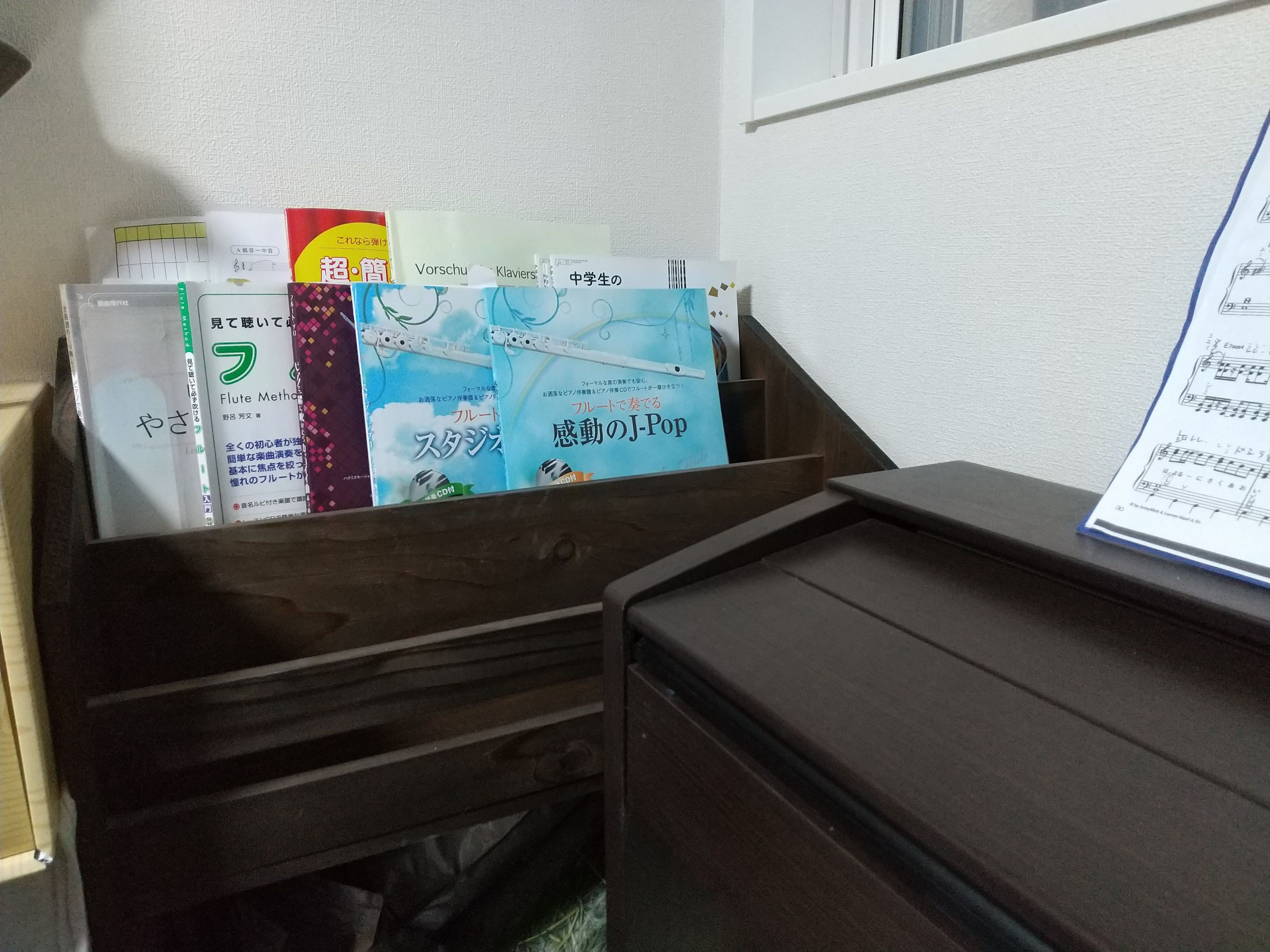 奥の2段には楽譜を、手前には楽器とお手入れ道具を置いてあります。