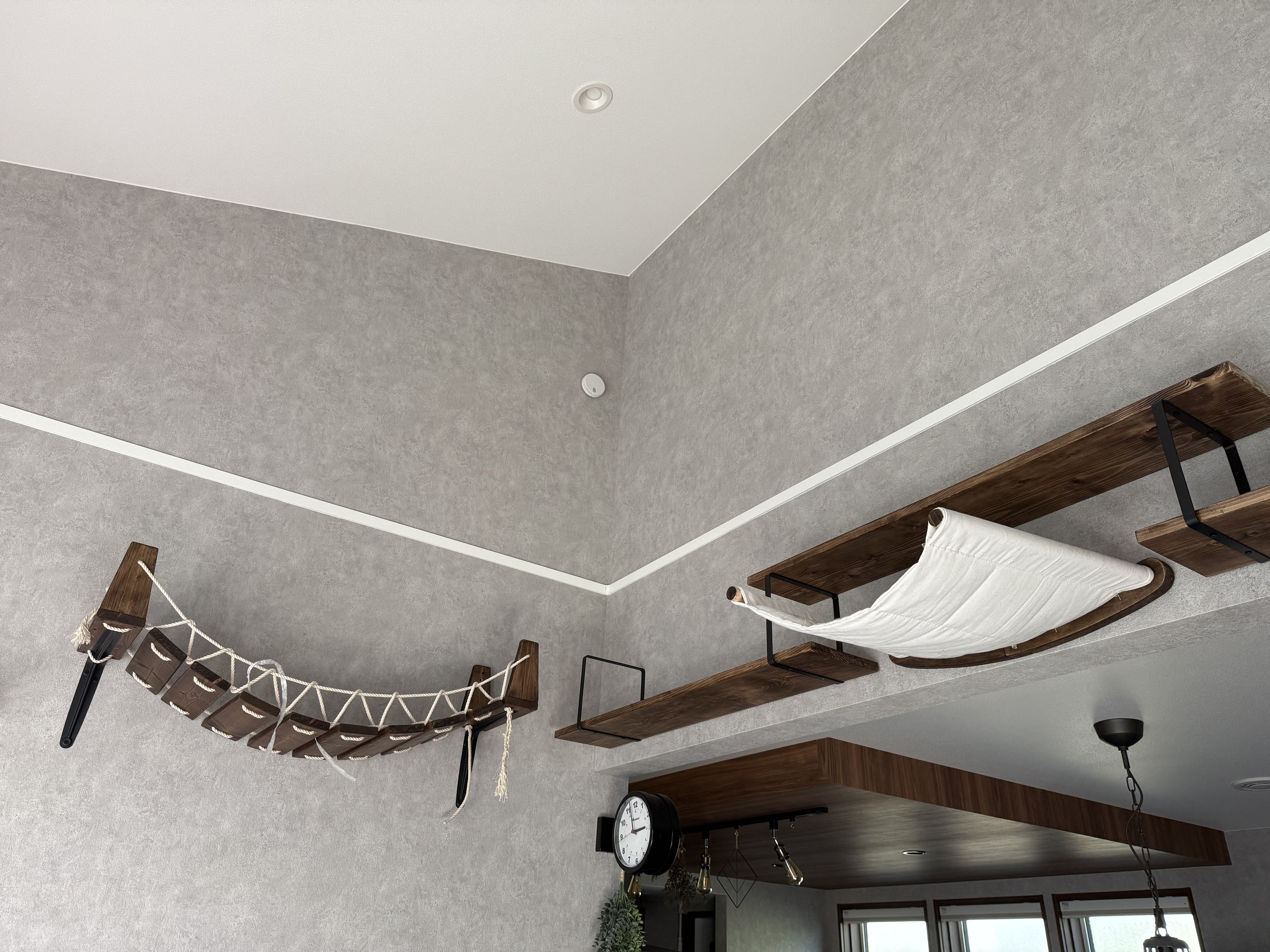 トップ > にゃん祭りDIY2026 > キャンペーン > 勾配天井キャットウォーク けーしーハウス 2026/02/22 12:55 勾配天井キャットウォーク ■作品内容 リビングの勾配天井の高さを活かしたキャットタワー、キャットウォーク ■作品のこだわりポイント 家の雰囲気に合わせたブラック×ダークブラウンのカッコいいデザインにしました。ハンモックがお気に入りで、よく上から人間を見下してきます笑 カインズで購入した木材、スクエアブラケット、ロープなどで作成しました! インテリア部門【にゃん祭りDIY2026】 キャットウォーク キャットタワー キャットステップ いいね 共有する 共有する X LINE リンクをコピー コメントする 0 件の返信 (新着順)