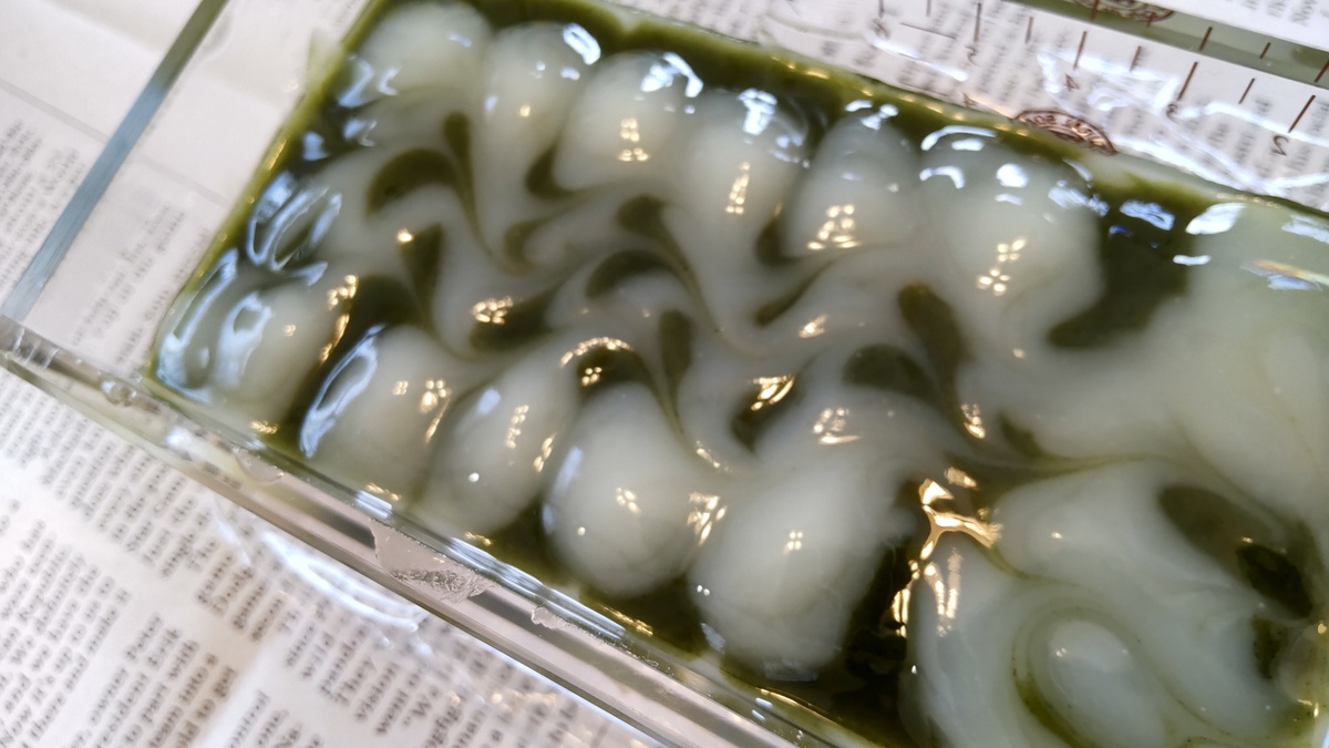 型に、カスタードクリームと抹茶ムース…じゃなかった、石鹸生地を注いで、マーブル模様になるように、ぐるぐるグルグル〜(((o(*゚∀゚*)o)))