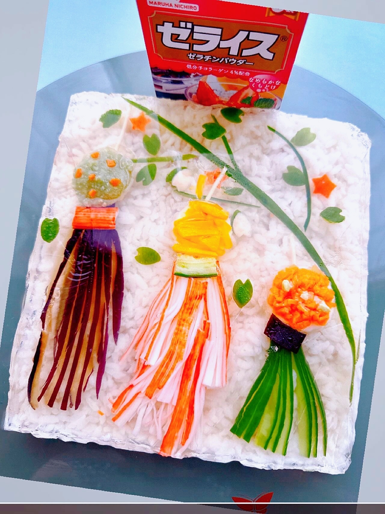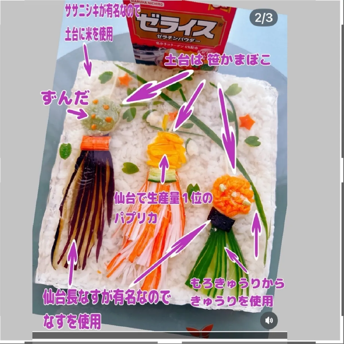 全てを宮城産食材で作る事は無理でしたが、宮城特産物を代表する食材で、仙台七夕まつりを表現してみました🎋