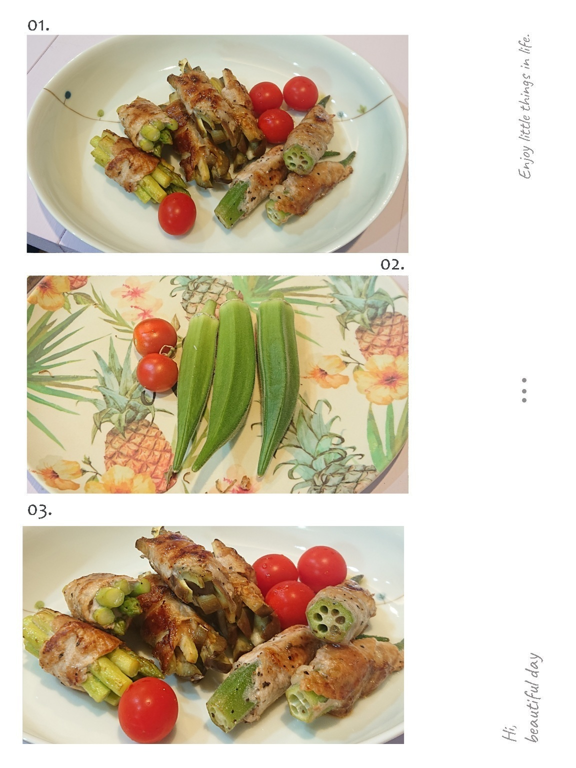 晩ごはん(自家栽培のオクラと水ナスの肉巻き♪)