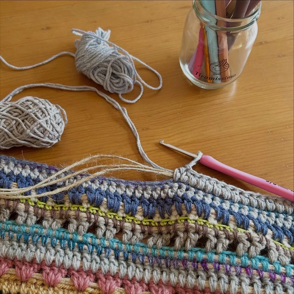 麻紐を編みくるむ!!強度も増し増しになり、配色もお洒落で素敵です😍🩷