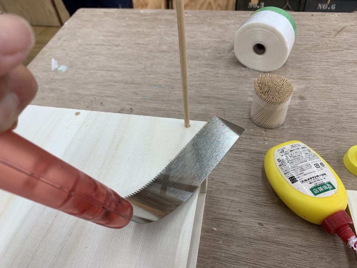 グイぃ〜んと板にノコを押しつけて