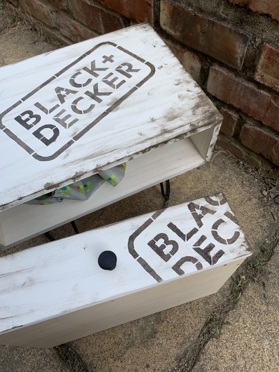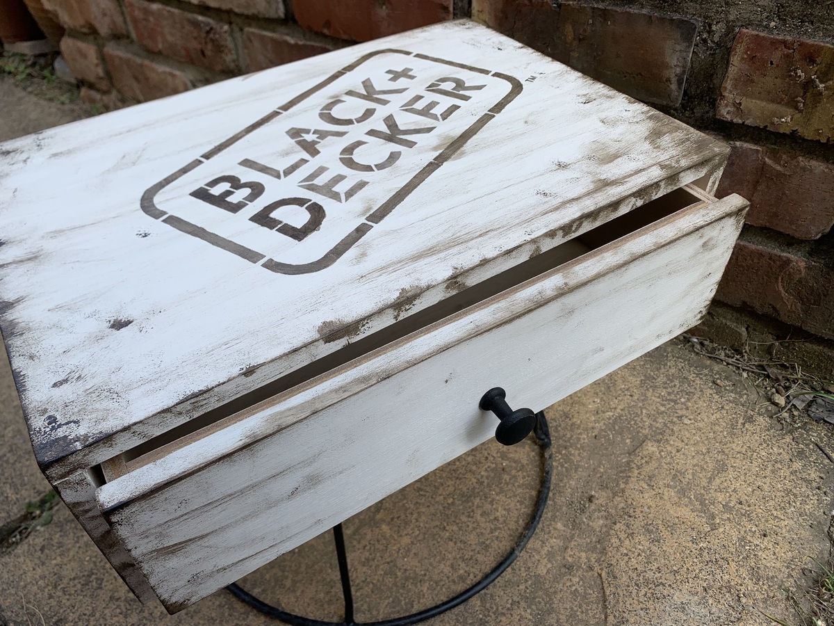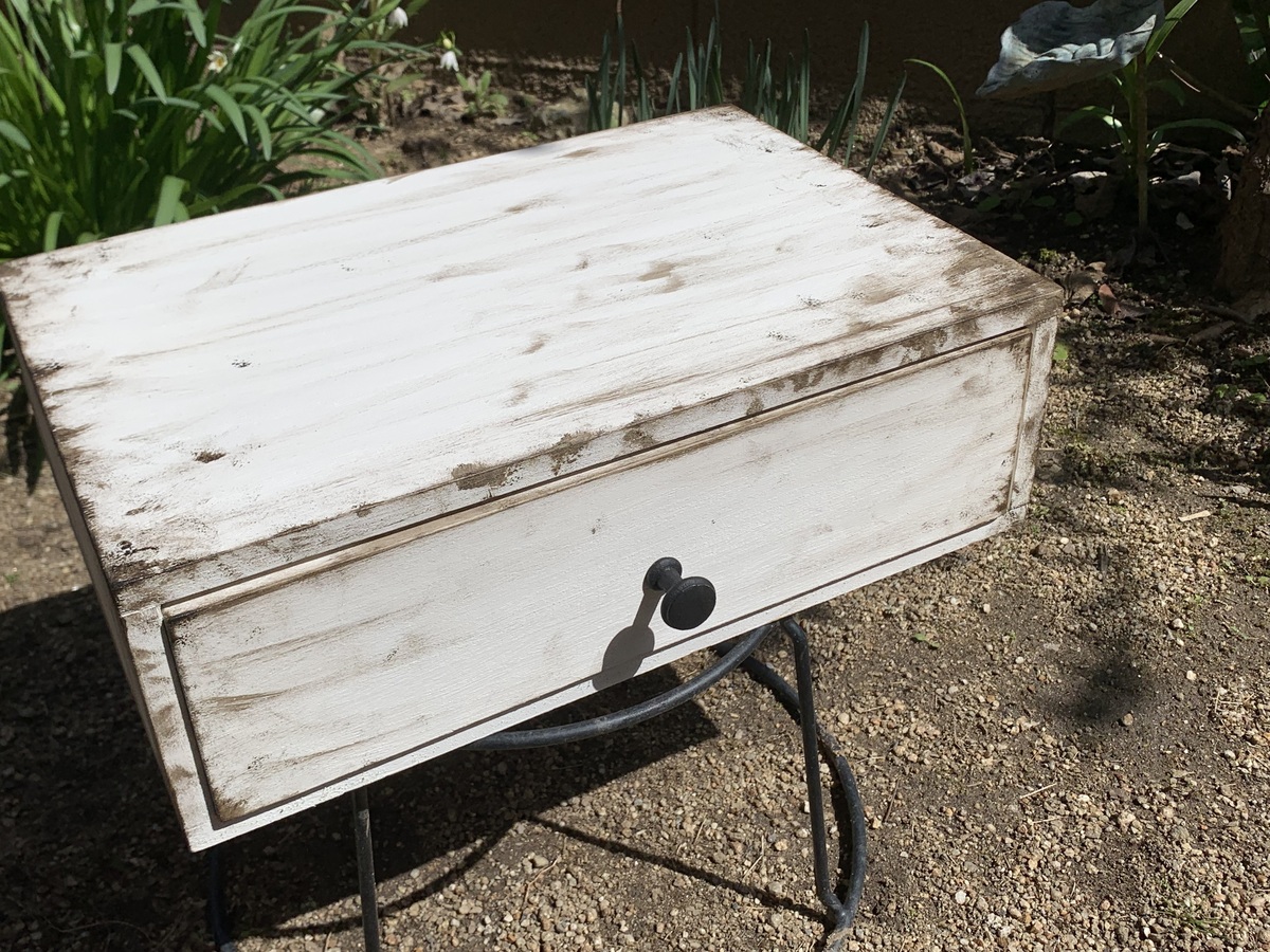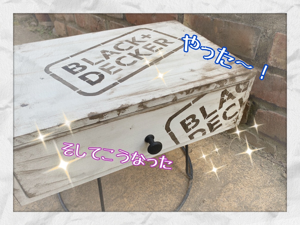 ビンテージ風に仕上げた引き出しに、ステンシルの黒が映えるなぁ〜✨