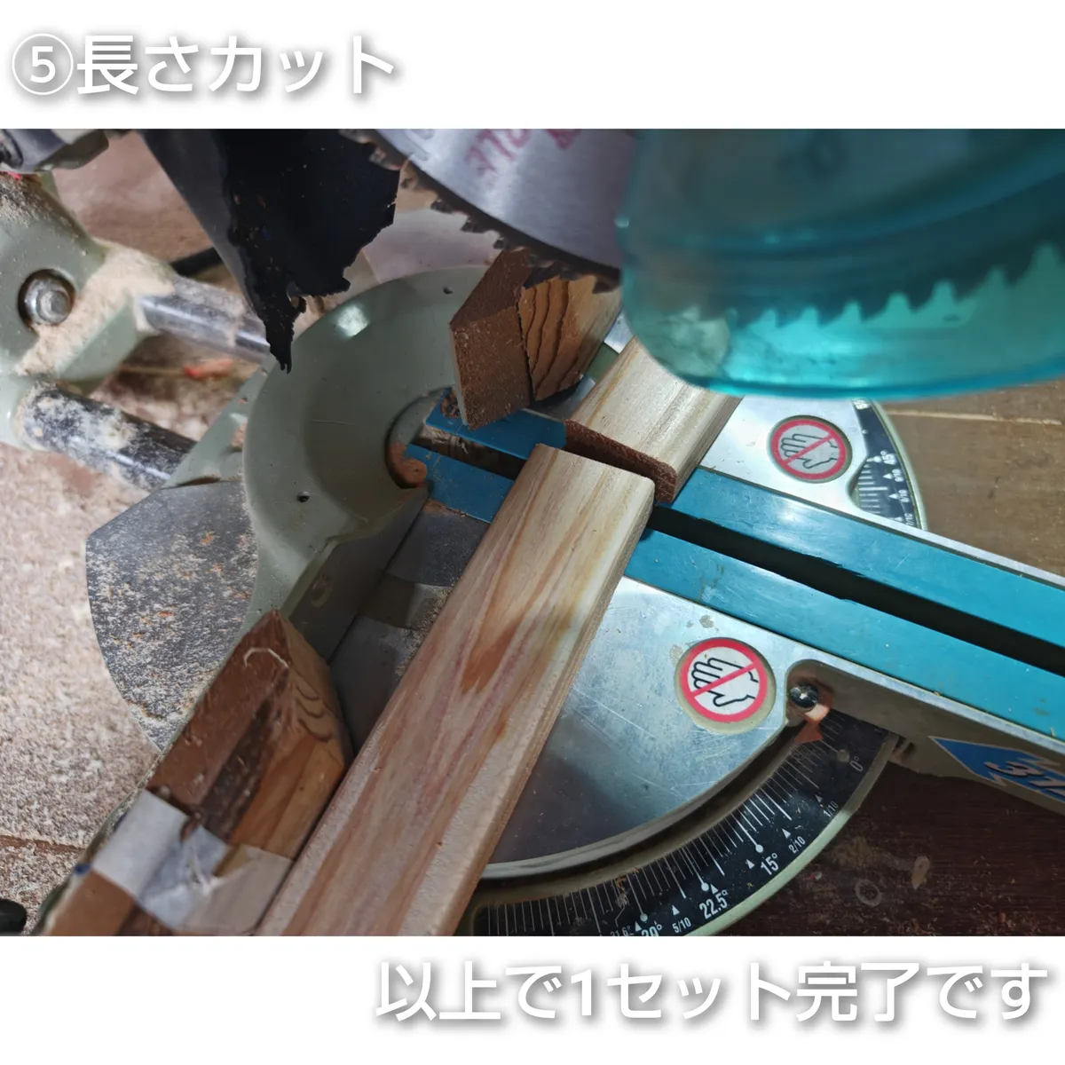 木工仕事に慣れた方でしたらスライド丸ノコの固定ストッパーをフリーの状態にしておけば、1時間で100セットくらいは作れると思います。