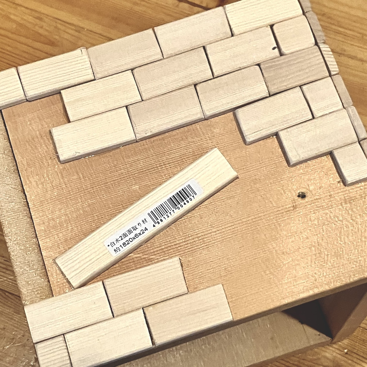 また、側面にレンガのデザインをつけてみたいと思い、その表現方法に悩みましたが、結局、細い板を刻んで並べる方法にしました。
