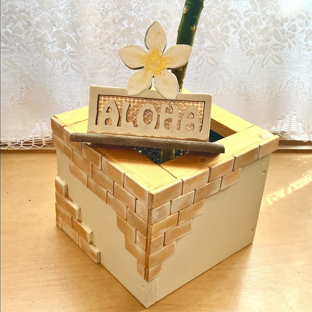 昨年、ハリ子さんから頂いたプルメリア🪴そのプランターカバーを作りたいと思い始めてから、早2ヶ月。途中、アイデアが行き詰まり、作業を中断していましたが、ようやく完成しました🌱
