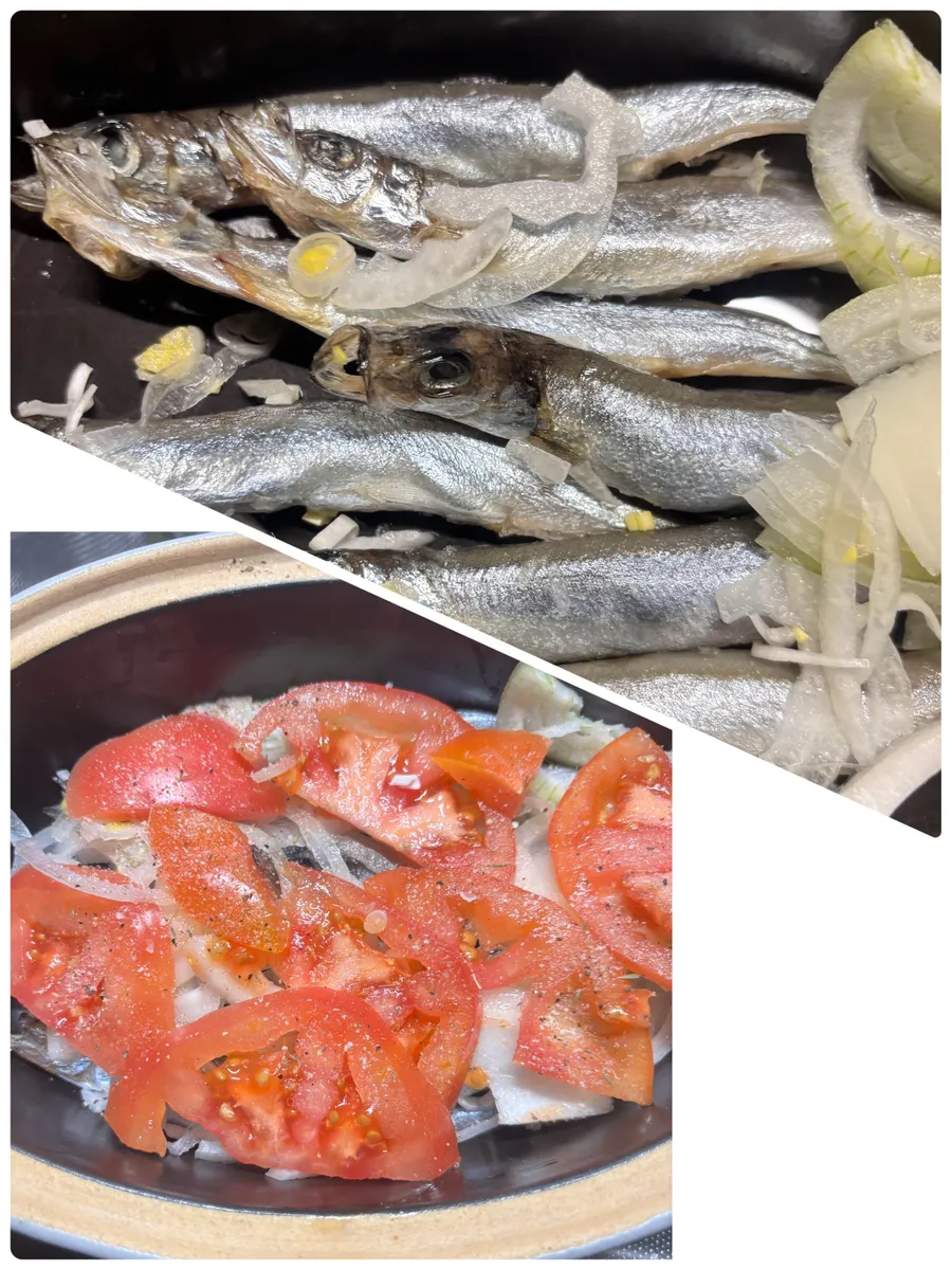 ししゃも9匹を器に並べ、玉ねぎ、トマトの順