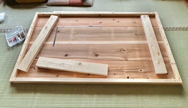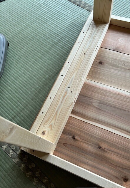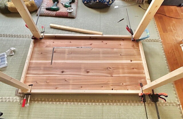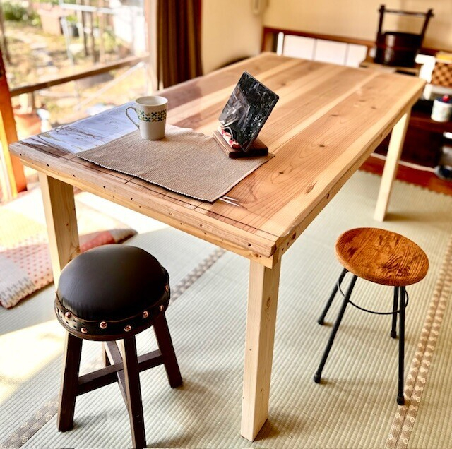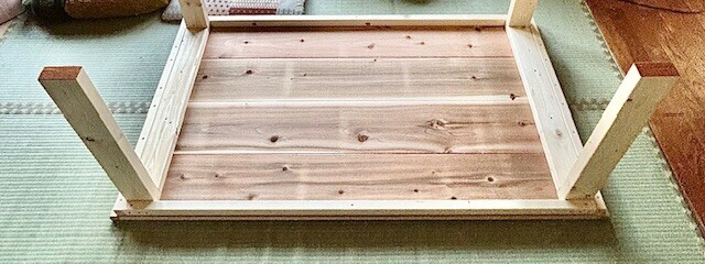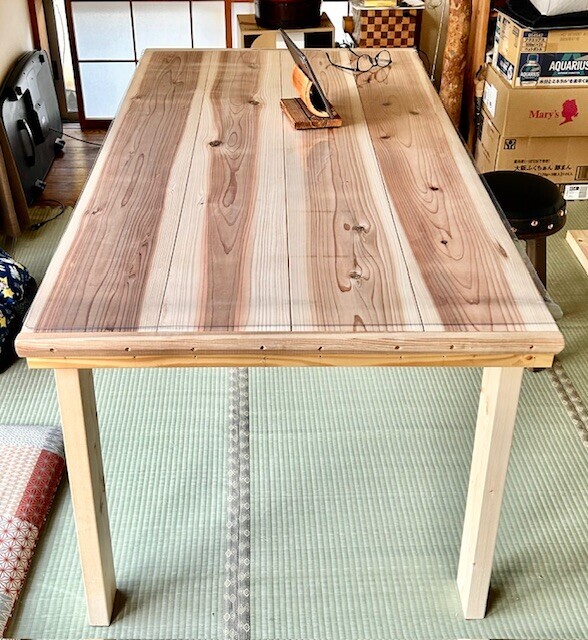 本当は脚の間に貫とそれを繋ぐつなぎ貫を入れようと思ってたんだけど、安定いいし、短辺の所にも椅子置きたいのでこのまま様子見ることにしました。