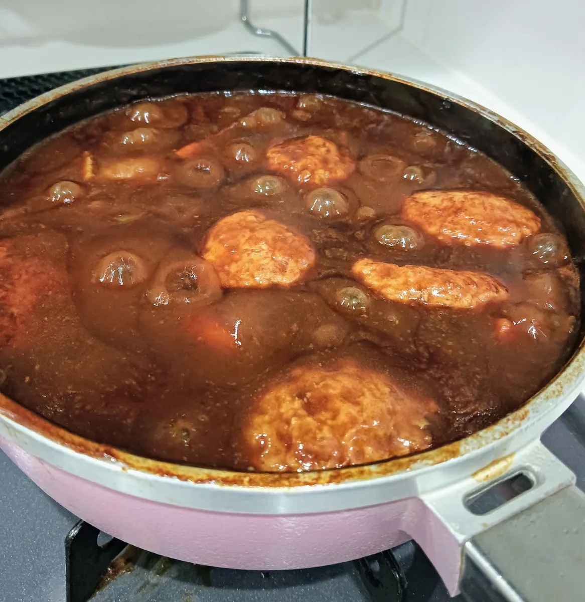 投稿を表示フライパンの中の煮込みハンバーグがポコポコ音を立てて煮ているのが判る画像でそそられます🤩✨👍