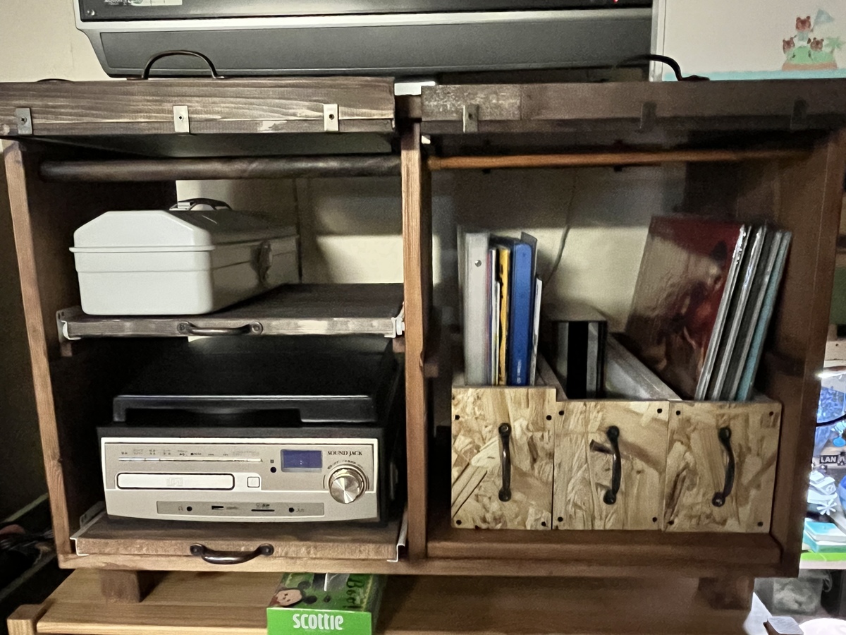 トップ > DIY > インテリア > ローシェルフ しょうしん 2023/03/07 21:57 ローシェルフ 以前に片方だけ扉をつけたローシェルフ。 ようやくもう片方にも扉を付け終わりました。 扉を上げて収納するとこうなります端材で作ったボックスにレコードやDVD、資料を入れましたこちら側は以前と変わらずレコードプレーヤーが鎮座 もっと早くするつもりがダラダラしてしまい、 こんなに時間がかかってしまいましたwww でも使い勝手には大満足してます。 いいね 共有する 共有する X LINE リンクをコピー コメントする 4 件の返信 (新着順) ミュートしたユーザーの投稿です。 投稿を表示 シン ひよっこ 葵 2023/03/08 19:48 しょうしんさん、こんばんは これはとてもいいですね、素晴らしい作品✨であり、オーディオ空間✨ いいなぁ 未来のために、お手本ブックマーーク┗(`・∀・´●) いいね 返信する ミュートしたユーザーの投稿です。 投稿を表示 しょうしん 2023/03/08 22:03 ありがとうございます😊 見た目よりもとても簡単なのでオススメですよ。 ぜひ挑戦してみてくださいね。 いいね 返信する ミュートしたユーザーの投稿です。 投稿を表示 ちきりん 2023/03/08 12:04 完成おめでとうございます! 色々なアイデアが詰まっていて使い勝手も良さそうだし、見た目もかっこいい! すごーいです♪ いいね 返信する ミュートしたユーザーの投稿です。 投稿を表示 しょうしん 2023/03/08 22:02 ありがとうございます😊 思い通りになって嬉しいです。 使い勝手も良いので大満足ですよ。 いいね 返信する ミュートしたユーザーの投稿です。 投稿を表示 calypso 2023/03/08 09:42 おはようございます。☀️ オーディオの所スライドするのってとても便利そうでいいですね。☺️ 私もこれを作りたいと思いました。 私が手をかけたら何年かかるだろう……😆 隠せるし、お洒落だし😊 いいね 返信する ミュートしたユーザーの投稿です。 投稿を表示 しょうしん 2023/03/08 22:01 ありがとうございます😊 スライドレールは意外と簡単でしたよ。 本来ならきちんと測らないといけないのだと思いますが、 何となくでも出来ましたwww いいね 返信する ミュートしたユーザーの投稿です。 投稿を表示 calypso 2023/03/08 22:13 おぉぉ!! スライドレール測らずに取り付け出来たんですね。😊 凄いです。👏👍 いいね 返信する ミュートしたユーザーの投稿です。 投稿を表示 べるん 2023/03/08 08:18 スライドの扉は、使い勝手も良くて素敵ですね✨ 扉にも好みのポスターなどを飾って、眺められるのも良いですね🤗 いいね 返信する ミュートしたユーザーの投稿です。 投稿を表示 しょうしん 2023/03/08 22:00 ありがとうございます😊 始めはこの扉の仕組みが分からなくて悩みましたが、 調べたらあっさり解決しましたw 好みのポスターやレコードを飾れるのは大きなポイントです。 いいね 返信する