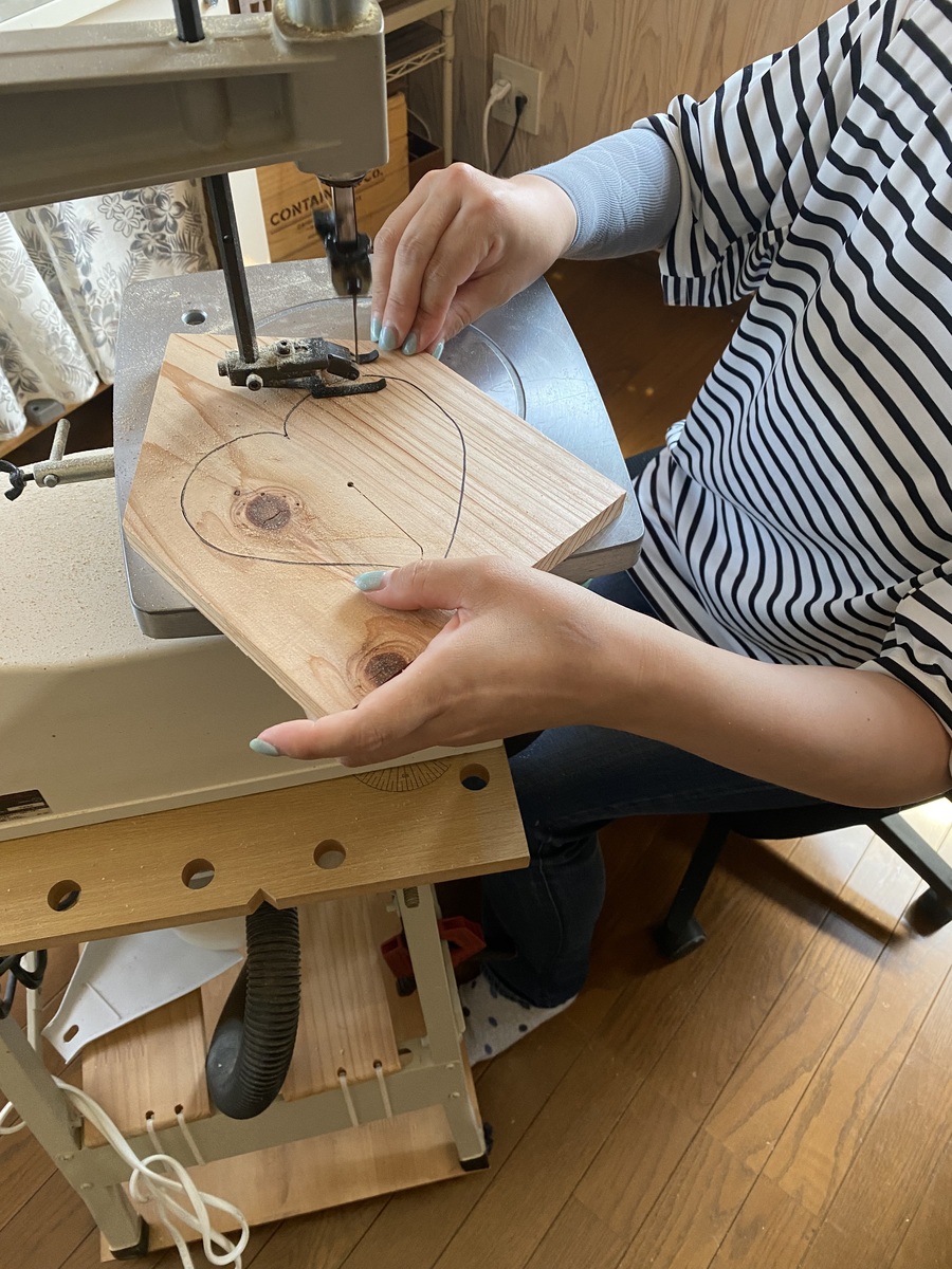 先ずは糸鋸の使い方を5分程度説明して、試作品のハート❤️をカット